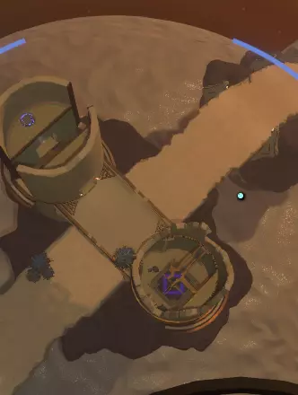你要找的东西就是类似这样的,但你必须在它刚被“发掘”出来的极早期阶段就找到它。 你会看到一侧(不是桥那边)开始显现出一个敞开的入口,**尽快冲进去,不要停下!** 你的右边会看到另一个入口。快进去,这里的通道布满了仙人掌,这就是为什么这是一个需要快速行动的限时谜题。 继续前进,快到尽头时,**你肯定会出现宇航服破损**,如果可以的话,尽快修好它,然后前往电梯/重力光束处。 在这里,你会注意到一个由球体激活的入口,不幸的是另一边是坏的,但这边是好的。 站到广场中央,抬头看。 等待太阳经过头顶,并且绕着它运行的那个小东西也到达头顶。咻—— 你现在身处【太阳站】,但没时间休息了,氧气正在消耗! 快速向下看,你会看到传送点。