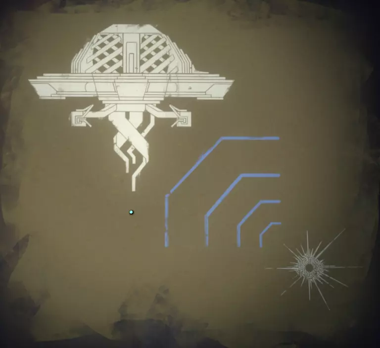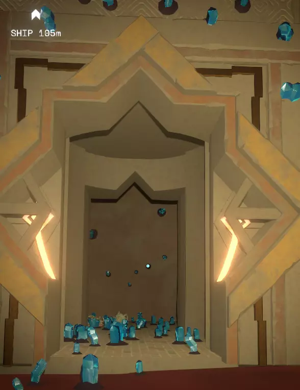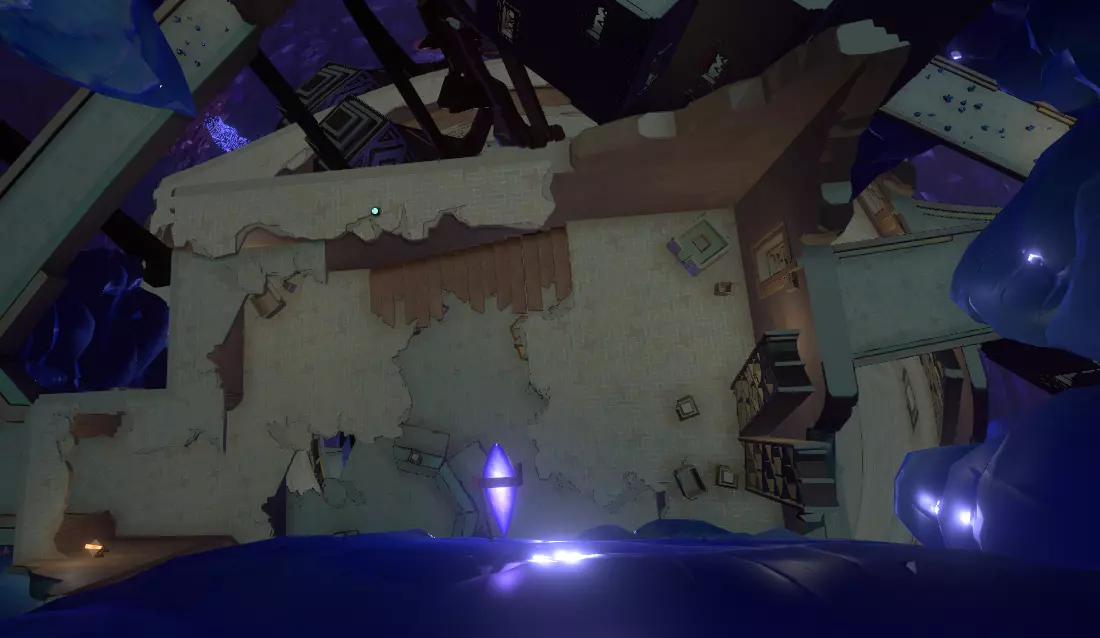 接下来我们要前往碎空星的跃迁塔(再次前往),但这次是为了完全不同的原因。 如果你还记得,碎空星的跃迁塔是三角形的。 穿过太阳站塔,你会看到一对塔,其中一座破损不堪、摇摇欲坠,另一座是圆形的,从上方看像个间歇泉,然后就是那座三角形的塔。 如果沙子还没落下,就等到沙子落下,你会在一面墙上看到一块蓝色的重力水晶。