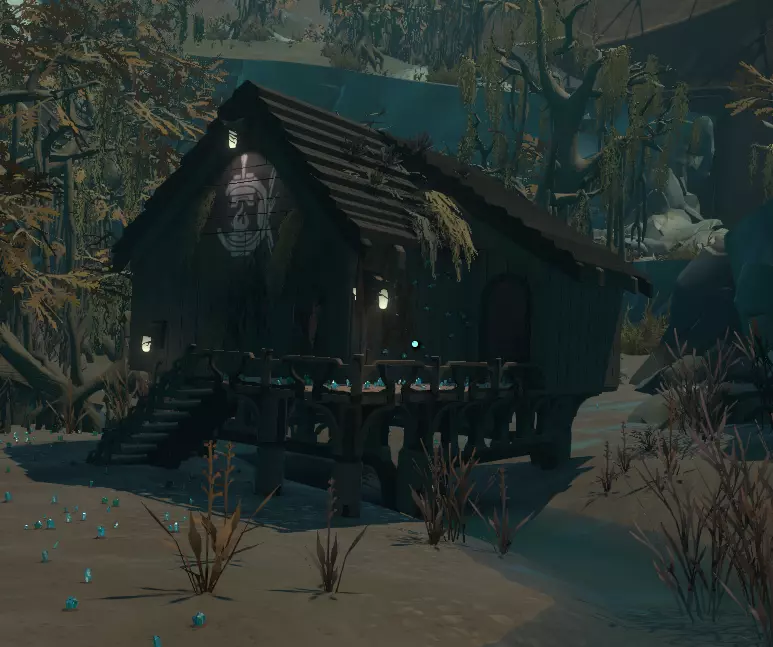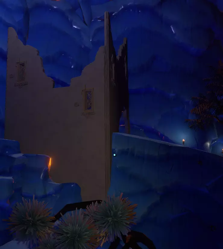 这个地方看起来像是一个废弃的定居点,你右边的小山上有一栋建筑,我称之为【画廊】。进去看看吧,里面只有这个世界居民的画作。
