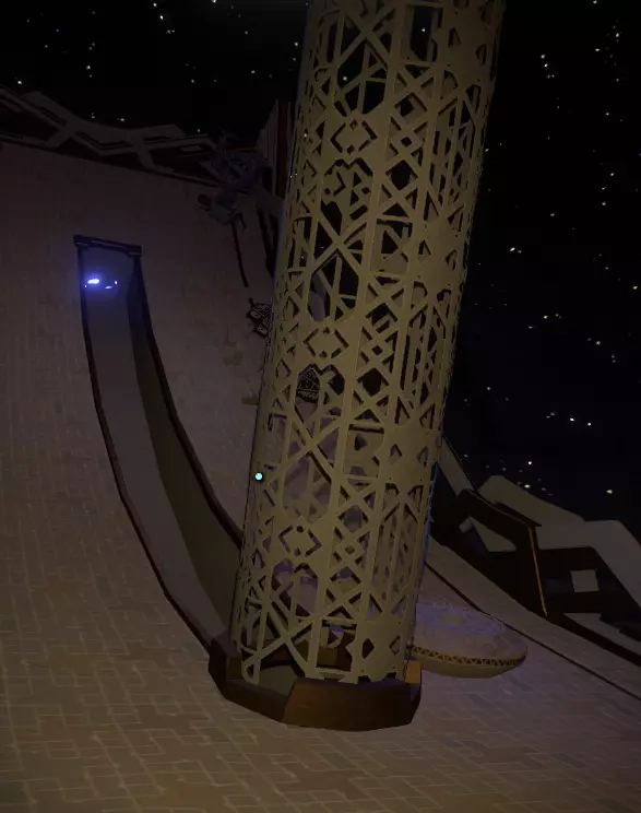 在这附近着陆,但不要太近,否则你的飞船会被沙柱吞噬。当大门开启时,进入内部。 前往中间的大广场,透过玻璃窗向上看。当碎空星(Brittle Hollow)运行到特定位置时,嗖的一下!你就会被传送到别的地方。 在这个新地方,抬头会看到悬挂城市和黑洞就在你上方,小心!不要从这个重力地砖表面跳下去! 沿着离开传送点的路径走,会看到一个悬浮的诺玛(Nomai)计数器。
