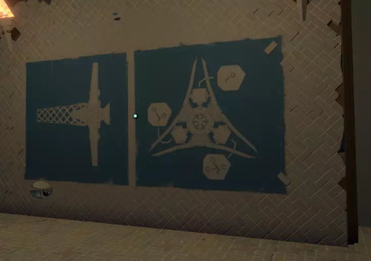 记录显示,诺玛伊人曾在此寻找【宇宙之眼】,并且该信号比宇宙本身还要古老! 从你现在站立的位置向右转。那里有一个门道,出去后沿着建筑物后面的小路向左走,直到你来到一条向下倾斜的走道。 穿过建筑物向下走。这里还有更多笔记,但它们并不重要,不会添加到你的飞船日志中。 当你走到不能再往下走的地方时,你会发现一幅三联画,这是一幅由三部分组成的壁画。