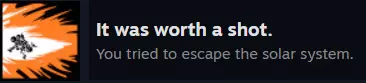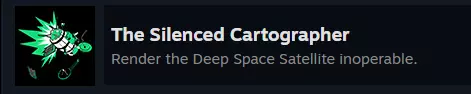 然后,当那个黑点开始遮蔽太阳时,我全力启动了 retros(减速引擎)朝着它飞去。 DLC - 可下载内容 - 首个成就 既然你已经找到了前往【The Stranger】的简便(或者说更简便?)方法,现在有一个(基本上)超级简单的成就可以获取了。 【The Silenced Catrographer】这个成就只能在你完成本体游戏及其令人震撼的结局之后才能解锁。 这个成就的描述其实已经完全暗示了你需要做什么:“让深空卫星无法运作。” 不过,以防你不知道或者还没弄明白,这里提供解决方案:从【Timber Hearth】起飞,飞往深空卫星。使用我第一次描述的方法找到它。现在,用你的飞船狠狠地、故意地踢那个家伙,使出全力!如果操作正确,你应该能解锁: