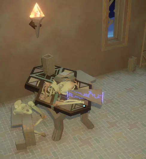 拿起这个,面朝墙壁时将其插入最右侧的墙上。在阅读它之前,进入旁边右侧的建筑。上一两层楼,你会看到一张桌子,上面有一具骷髅和另一卷卷轴。