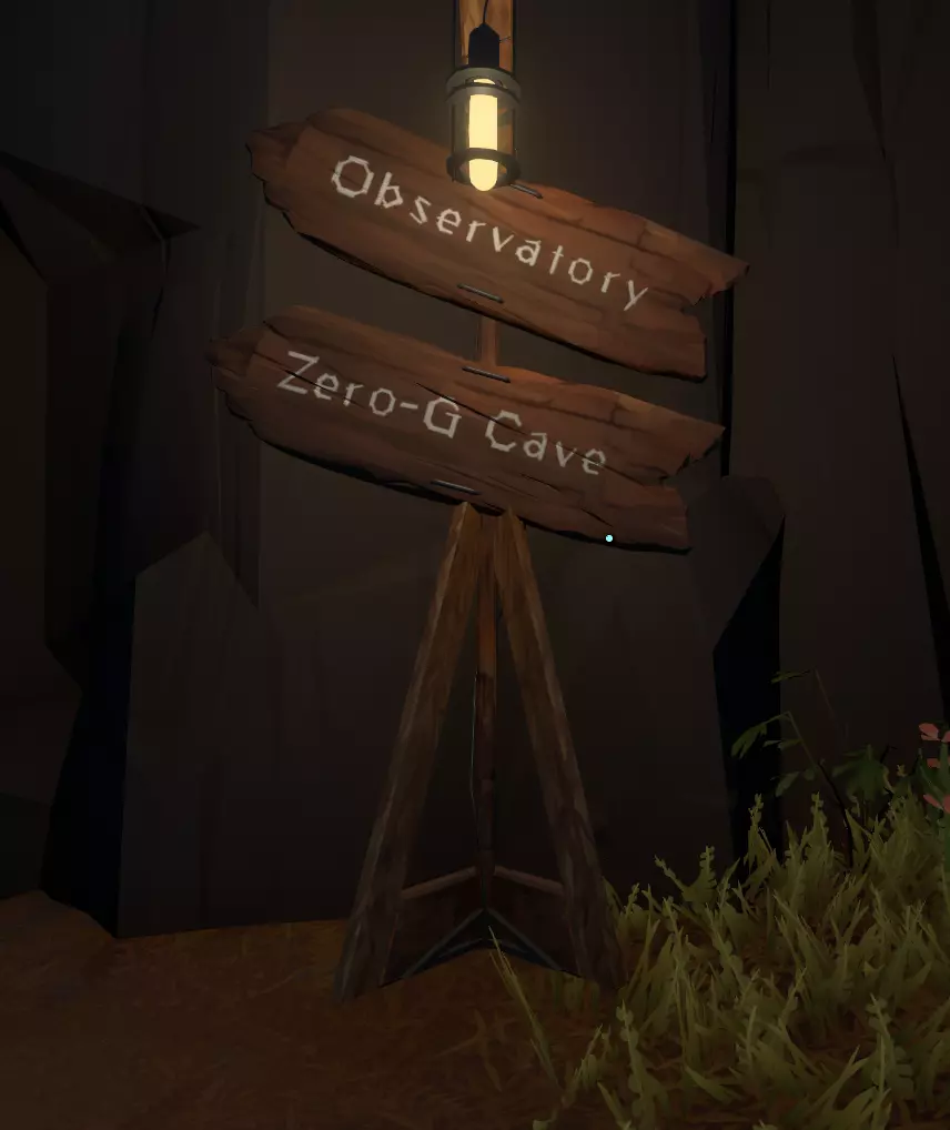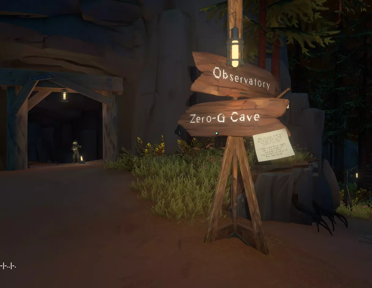另一个值得一看的重要地点是博物馆。没错,馆内收藏了许多从宇宙各处收集来的大多无用的文物,它们能为你提供一些零碎信息。 但除了获取发射代码以及与诺玛伊雕像互动外,这里还有一个【绝对值得关注】的东西。 一楼左侧有一扇门,通向一个小型室外区域,那里有一块发黑且闪闪发光的岩石,当你不直接注视它时,它似乎会消失。如果你用信号镜对准它,会显示一个频率并显示名称“Museum Shard”。 这是你与量子物体的第一次互动! 你的村庄所在的陨石坑内大致就是这些值得一看的内容了。 木炉星 第二部分 起飞!现在你应该准备好登上小型飞船,去探索这个狂野而未被驯服的太阳系了。 不过在离开你的小家——这颗岩石星球之前,还有更多东西值得一看。 你首先可以探索的地方之一(我并没有按特定顺序排列)是木炉星上的另一个陨石坑。 你可能已经注意到零重力洞穴附近有一座塔。塔的底部附着着一张纸条。 阅读纸条后,你会了解到特克泰特的事,他已经前往一个正在冒烟的陨石坑进行调查。 登上小型飞船,飞离星球表面。 你要寻找的是一个有烟柱冒出的陨石坑。