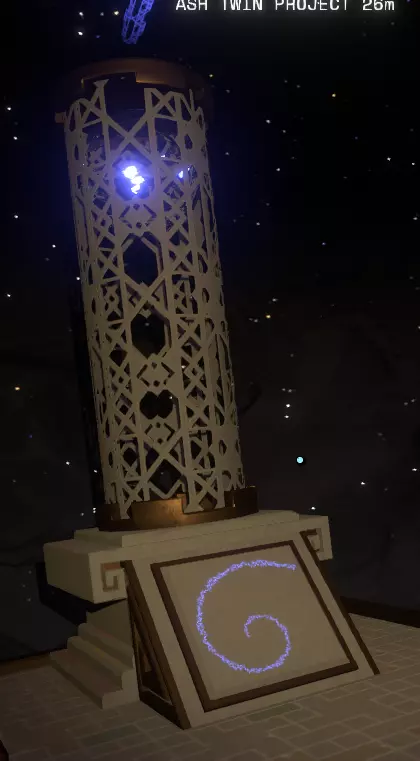 沿着裂缝向下进入零重力区域,欢迎来到【破裂核心】!在这里,你会发现一个漂浮的【诺玛伊人】和另一份记录。翻译这份记录可以了解【幽灵物质】的起源以及其他会更新你飞船日志的内容。由于离开这里几乎不可能,你需要冥想或通过主菜单重置,回到新循环的开始。 【太阳站】 这是一个非常困难的限时谜题,需要快速完成。我通常在营地打盹不超过45秒,最多一分钟,然后开始解谜,原因稍后会变得非常明显。跳进你的飞船起飞,做180度转弯(寻找太阳),然后找到【灰烬双星】/【余烬双星】。你可以根据需要设置自动导航,但要小心,因为这会让你沿着最直接的路线前进,可能会让你直接冲向太阳!绕过刚才提到的太阳,然后再次自动导航前往灰烬双星。随着沙柱转移到余烬双星,太阳 warp 站可能是第二个开始被揭露的结构。