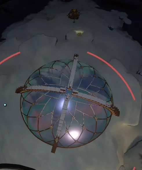 在你的探索过程中,你很可能已经从诺玛族探险家那里了解到不少关于它的信息,包括确实有一艘飞船成功着陆过。你尝试过吗?直接穿过去了?那么,我们该如何在一颗你不看它就会消失、而且似乎根本无法着陆的卫星上着陆呢?答案就在量子试炼中——如果你按照本指南操作,可能已经完成了这些试炼。在那些试炼中,我们了解到量子物体,以及有时通过给量子物体拍照,你可以让它保持静止!接下来的部分将揭示如何着陆量子卫星。如果你已经完成了量子试炼,结合你对量子物体及其行为的了解,答案应该会很明显。如果没有,请继续阅读:首先,找到量子卫星。从木炉星开始新的循环时,进入你的飞船并起飞。 量子卫星可能在木炉星附近,也可能不在。如果用眼睛无法立即看到它,拿出信号镜并在周围搜索未知的量子信号。 一旦锁定信号,就朝着它飞去,尽量保持视线可见。 靠近它时,**不要尝试直接着陆!** 出于某种原因,这个量子物体的行为与其他物体不同。 离它太近会使它变得无形,你会直接穿过去。 那么我们该怎么办? 拿出你的探测器发射器,给卫星拍张照片。没错,即使你还在飞船里也可以这么做。当你在穿梭机内拿出侦察兵发射器时,你会注意到右上角弹出一个小方块。用侦察兵拍摄的图片会显示在这里。【不要关闭这张图片!】一旦你拍好了照片,保持画面打开。现在,你应该就能降落到星球表面了。量子卫星其实并不大,除了零星的树木外几乎没什么东西。一开始,你只会看到一名已故的探险家(不是 hearthian,而是 nomai)和一段记录。如果你在 brittle hollow 召回穿梭机时还没读取过这个装置,那么你在这里可以读取,但如果已经读过了,就无法再读取了。这里还有什么?看起来没什么特别的。但如果你旋转几圈(一次或多次),一座建筑就会出现。这是量子神龛(是的,它是一个量子物体,其行为符合量子特性,当你不观察它时就会消失。)