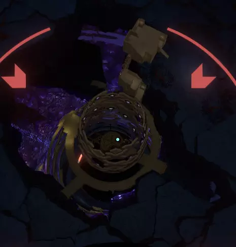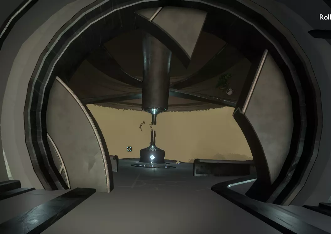 你可以通过这条路前往【悬城】,不过你必须在循环的相当早期就这么做。因为当行星被熔岩炸弹轰击,地壳碎裂并坠入黑洞时,这些桥梁也会随之消失。 穿过桥梁后,右侧是中央竖井。 相反,向左转并走一小段路,会发现右侧有一个入口。旁边石头上的【诺玛语】文字表明这里是【黑洞熔炉控制台】。 进入内部并走下楼梯,你会看到这样一个装置: