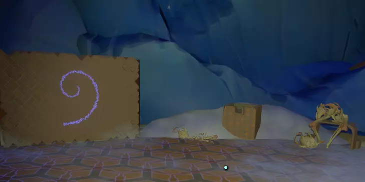 向上喷气并走上楼梯。 在这里你会看到一个奇怪的装置,还有成堆的旧幻灯片和灰烬,同时你还会收到一份飞船日志更新。 左侧墙壁旁有一些向下的楼梯,走下去。 底部有一扇敞开的门,一幅画前有一盏 lantern(灯笼),拿起 lantern(灯笼),把它带上楼梯放下,然后回到画前,会发现出现了一个幻灯片卷轴。