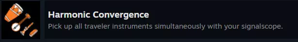 和谐汇聚 这个成就是与【It was Worth A Shot】紧密相关的。 它可以在游戏中的任何时候完成,但在第一或第二循环时更容易完成,这样就能把它解决掉。 方法如下: 当你正以最快速度飞离太阳并等待不可避免的结局时,你可以拿出信号镜并对准太阳。最终,行星们会排成一条整齐的直线,你应该能听到所有探险家的乐器同时演奏。 如果操作正确,你将解锁: