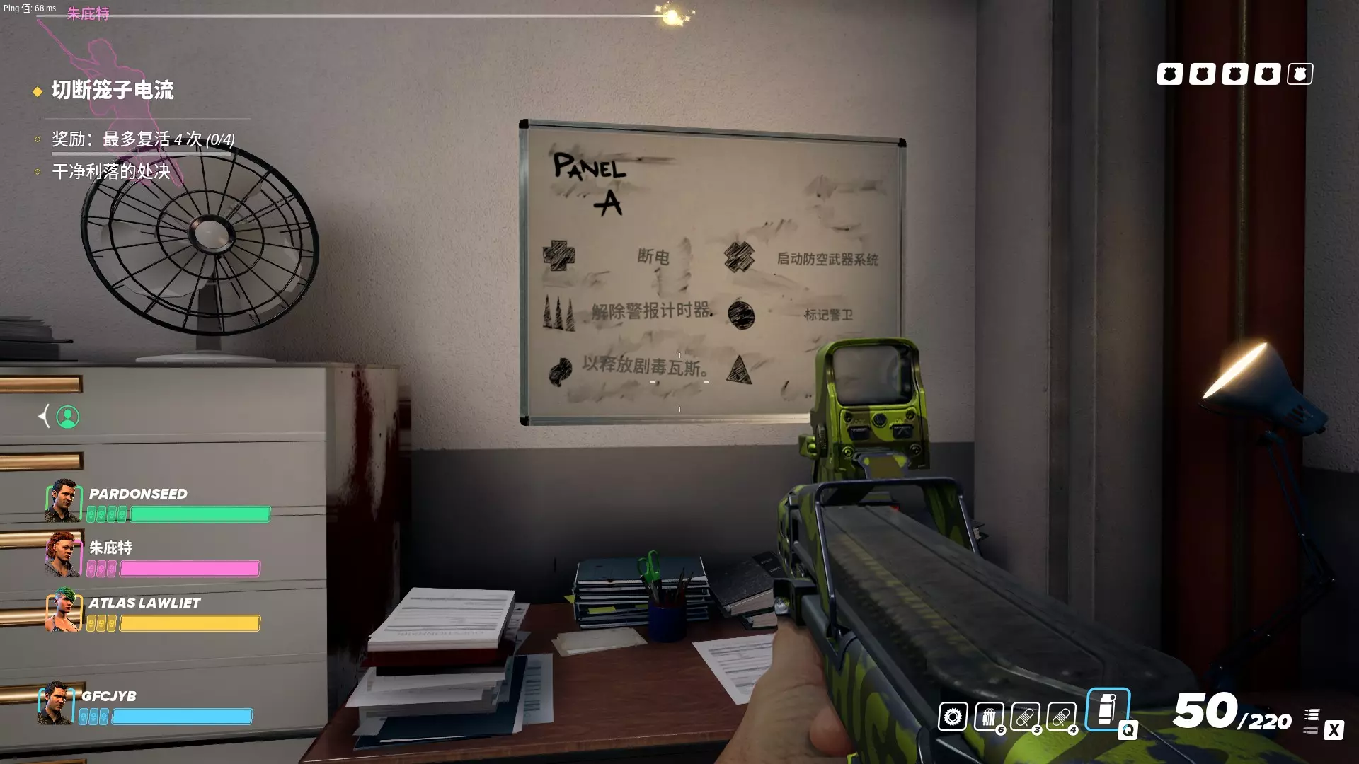 因此建议开局时慢点杀保安,先标记再杀,这样就能看到谁有钥匙了。 DLC大型劫案:金杯(空中潜入) 这关在多人模式里会很常见,因为潜行完成的话刷钱和经验的效率很高,所以建议每个玩家都熟悉本关的潜行打法。 进地图后会从通往屋顶的门那里出来两名警卫,滑翔机没来得及收的话怀疑度就会一直涨,所以赶快收掉或者快速压制两人,非普通难度的话可能要用一下静音炫光弹。之后压制三楼的警卫,建议逆时针绕一圈,进入控制室,然后去二楼的B1和B2办公室看一下白板,会写控制室中按钮的功能: