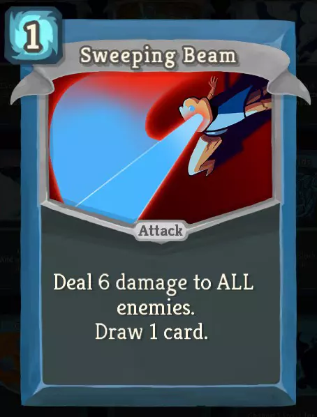 在游戏初期,【横扫光束】能帮助缺陷者轻松应对那些本可能更难的战斗。到了后期它的效果会减弱,但抽一张牌的效果让它不至于变得太糟糕。