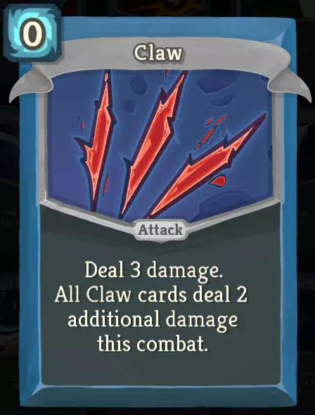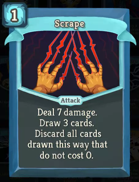 刮擦是零费构筑的标志。如果你的牌组中有大量零费卡牌(其中缺陷角色拥有很多),这张牌会经常触发,并频繁地通过巨额伤害连续进行回合。万剑归一也是一个标志,不过作为稀有卡牌,它出现的可能性较低(单张刮擦或万剑归一就足以支撑这套构筑)。与其他一些标志不同,拿起刮擦并不要求你已经为这套构筑投入了卡牌。它显然不会立即产生效果,但构筑中许多强大的零费卡牌都是普通品质,很容易获得。爪击是配合刮擦的最佳零费卡牌,而且它是普通品质,所以在游戏过程中你可能会看到多张。
