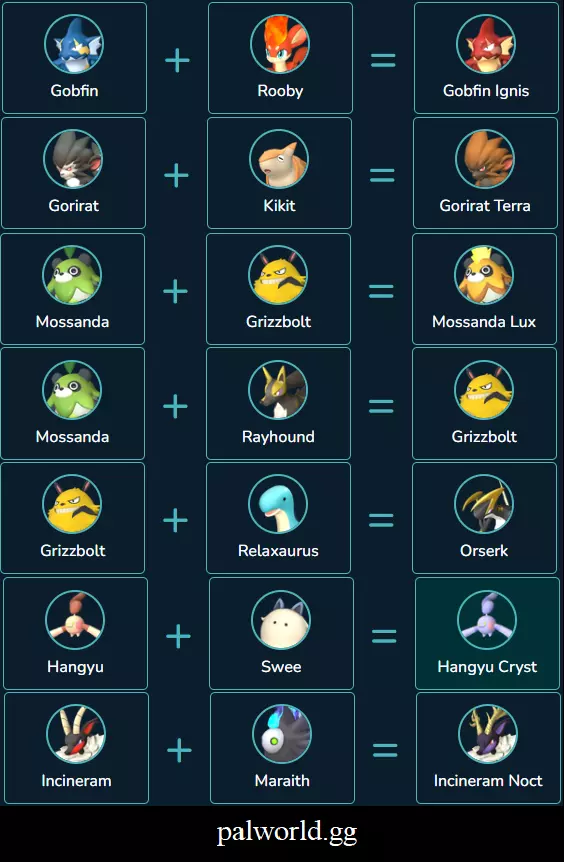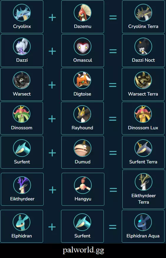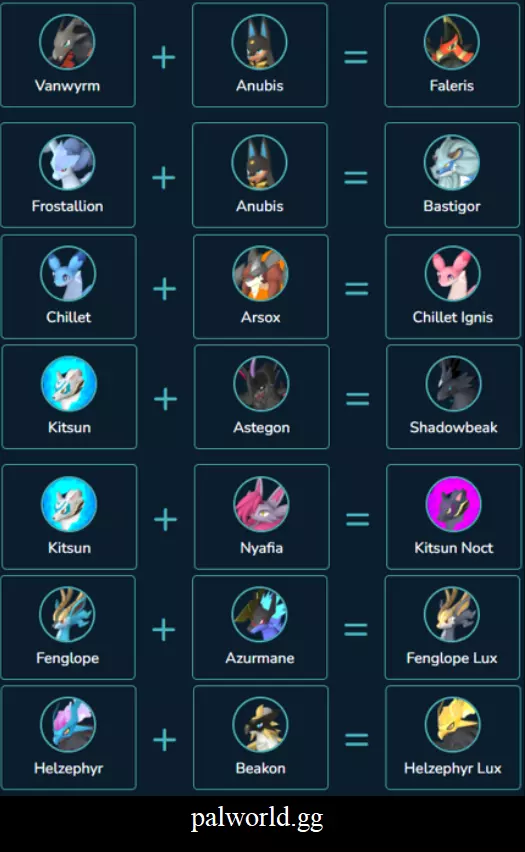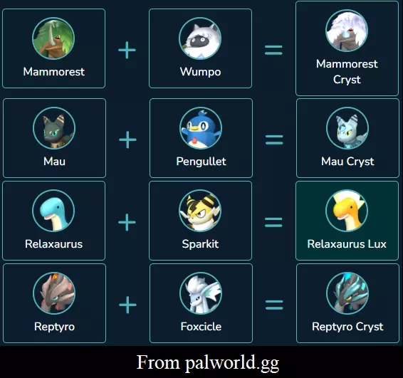这些内容来自幻兽帕鲁维基网站,虽然不是获取幻兽的最佳方法,但该网站是查找获取幻兽方式的最简单途径,不过它缺少很多内容,例如【 Relaxaurus + Celaray = Anubis】。