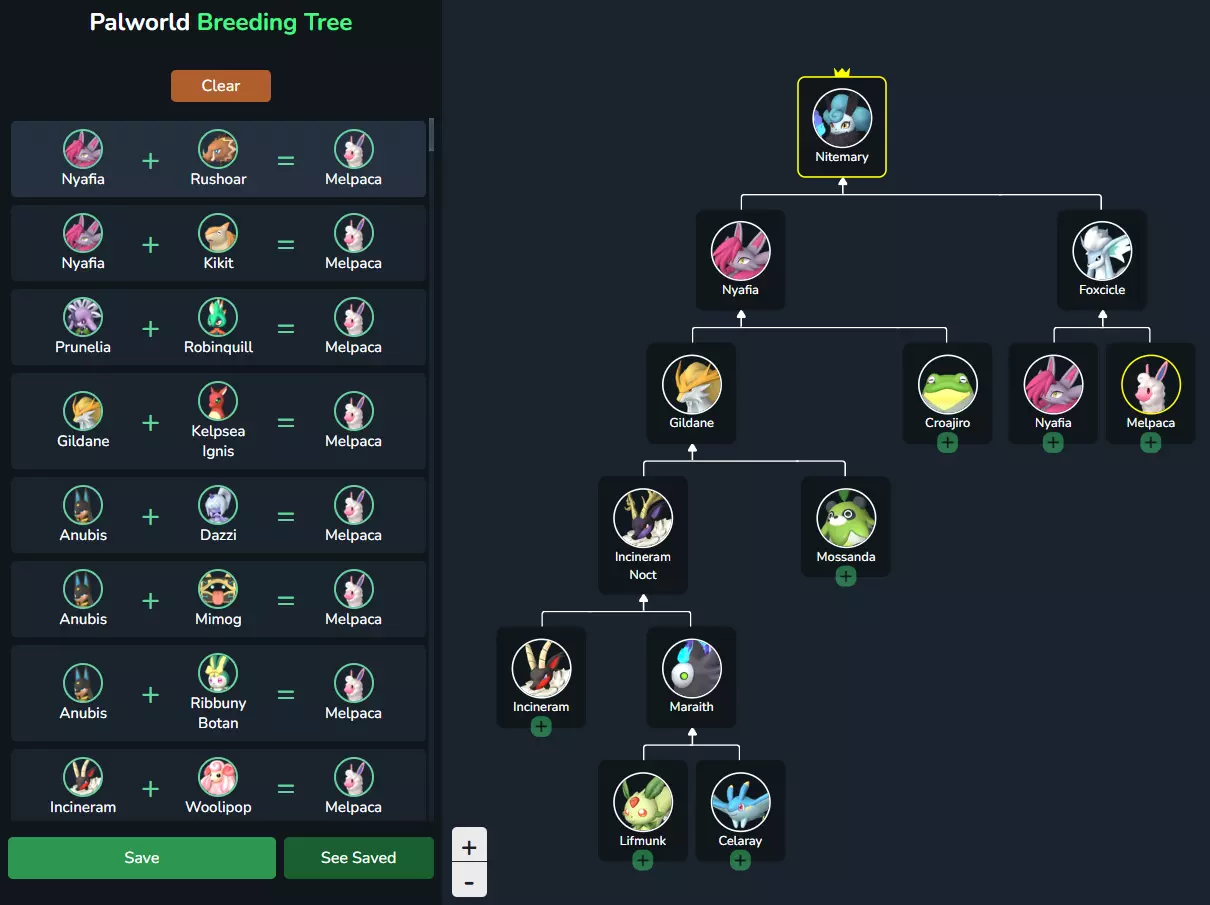 然后是伙伴合成器,你点击一个帕鲁,选择一个组合,然后点击加号添加更多组合。我不太想在指南里加入太多合成路线,因为适合我的不一定适合大多数人,但我会添加一些对大多数人都有用的。等我有时间,我会经常编辑指南,加入我发现的尽可能多的实用组合。