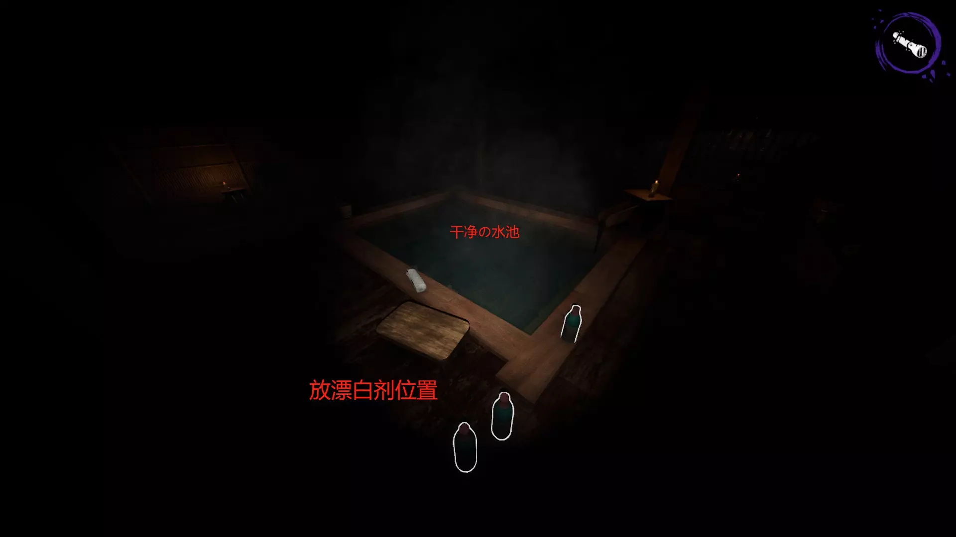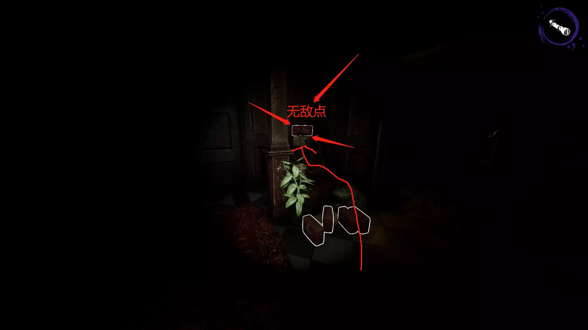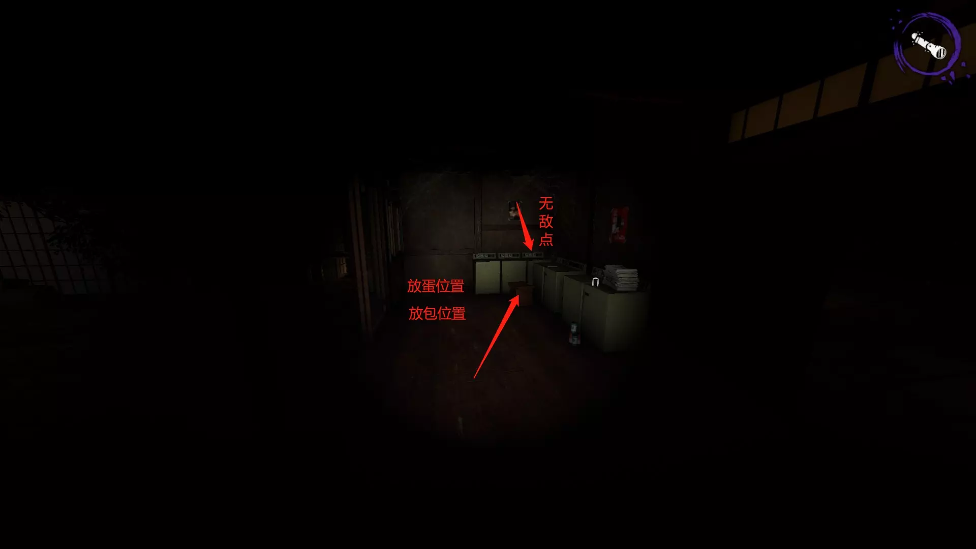 开启鬼模式后会出现小鬼,俗称匍匐哥,它只会在地上爬行,然后抱住玩家的腿导致无法移动。如果不用紫外线照射,过一会儿它就会倒地,也可以直接用紫外线将其照死。 大鬼安娜可以被紫外线照射至硬直状态,硬直时间约3秒。安娜被照晕后,要立即关闭手电快速逃跑,躲到掩体后方或无敌点。关闭手电非常重要,能在一定程度上降低被发现的几率。 无敌点位于祭坛附近的一个铁笼子顶部。当安娜靠近时,如果她向右跑,玩家就向左挪动;她向左跑,玩家就向右挪动,通过左右移动来躲避她。