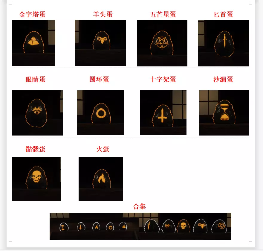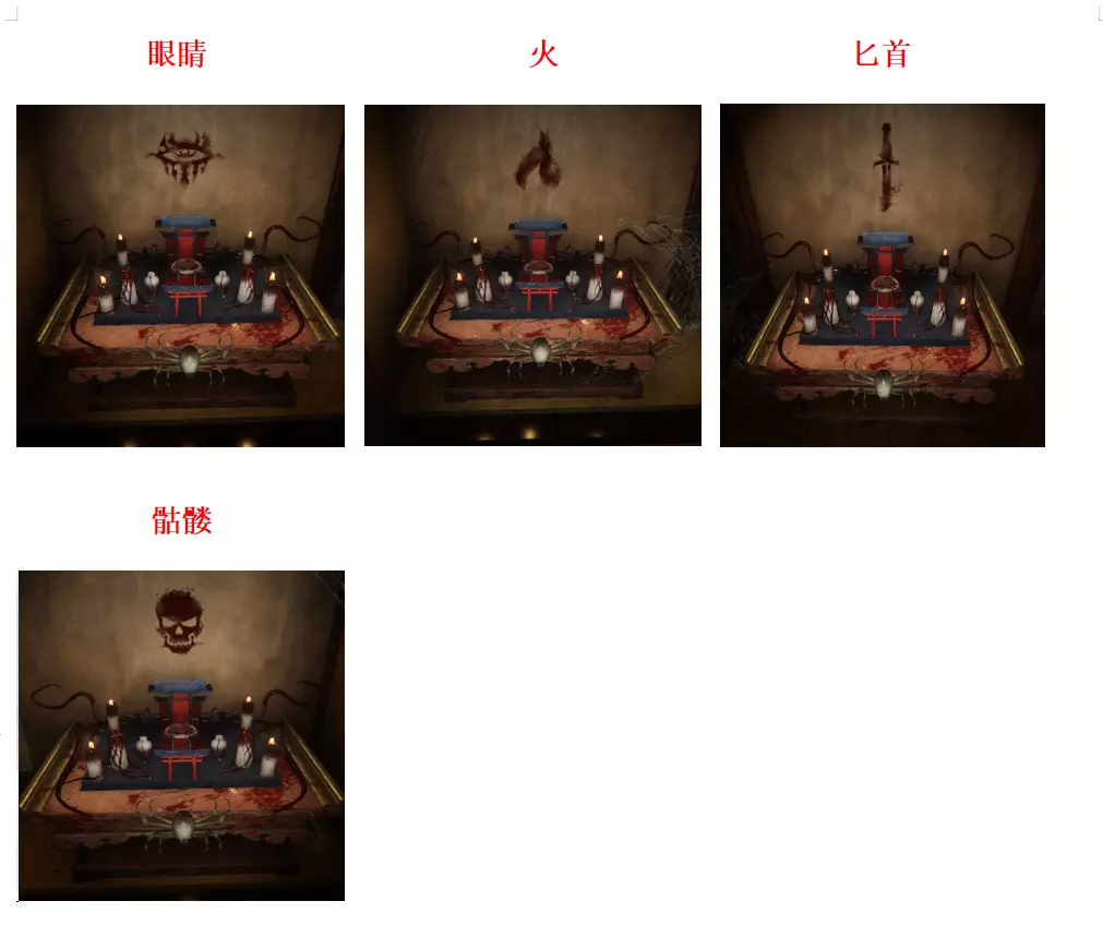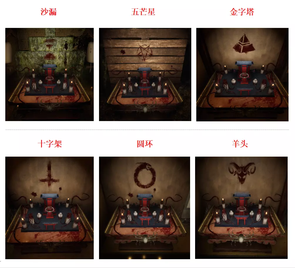 地图内共有1~8号房间,其中1号、2号房间位于1楼,距离较近;3~8号房间及储藏室位于2楼,3号、4号房间与储藏室相邻,距离较近,5号、6号房间相邻,7号、8号房间相邻。每局房间内的祭台位置均为随机,全图设有多个祭台点位。