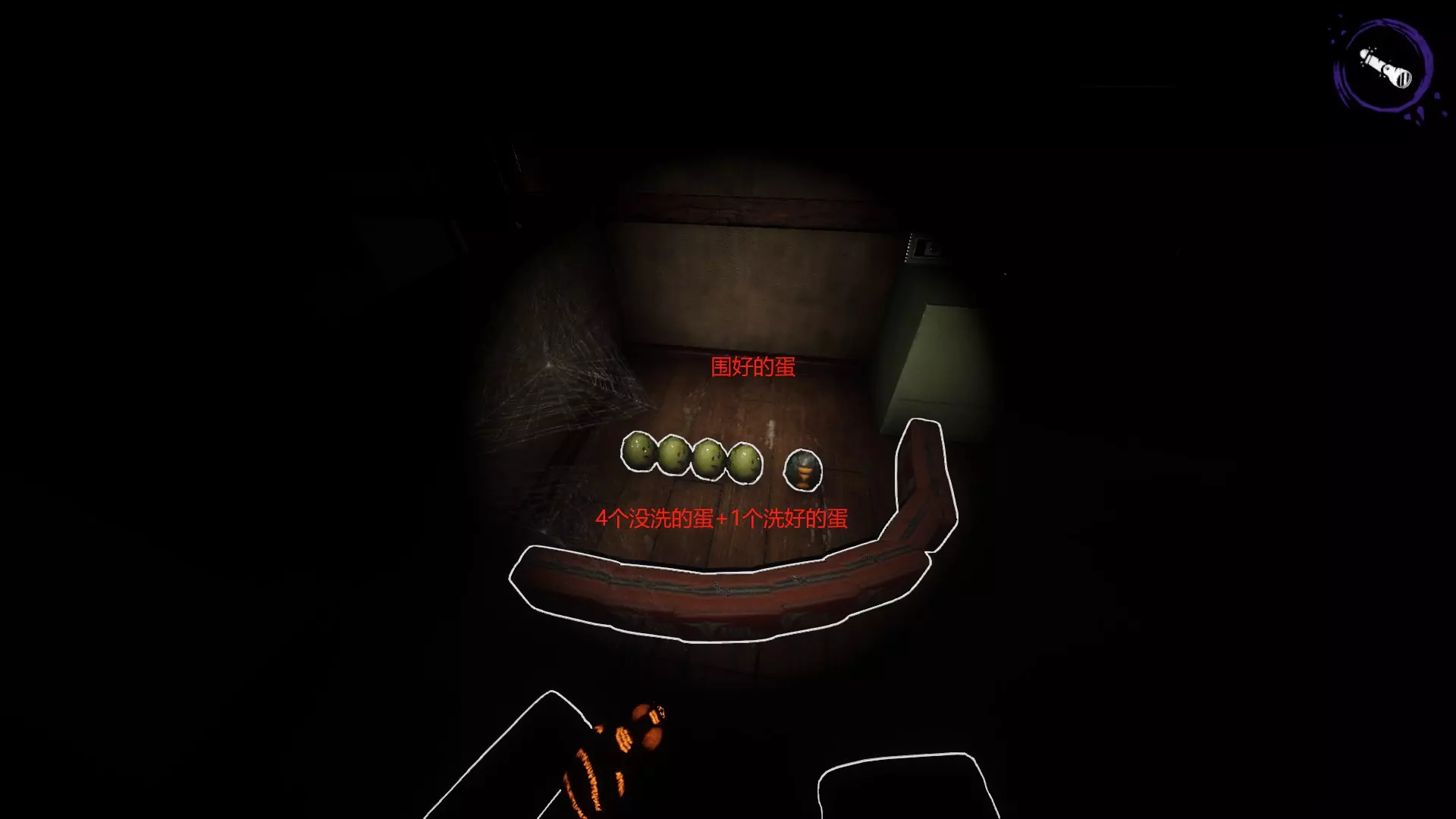 这图中的小鬼是小蜘蛛,被其攻击会减速,受到5次攻击会倒地。小蜘蛛会偷蛋,例如蛋和你在一起时,它会直接偷蛋而不攻击你,用紫外线即可照死小蜘蛛。 钥匙通常刷新在洗蛋池、洗衣机房、电视房、一楼柜台、一楼厨房以及二楼房间内。 房间上锁规则:若1号房间上锁,隔壁的2号房一定不会上锁;5号房间上锁,6号房一定不锁;储藏室必定上锁。 她吐出的蛋是脏蛋,需要拿到洗蛋池清洗干净。洗蛋池位于洗衣机房对面,需使用漂白剂清洁水池后才能洗蛋。因此要寻找蛋、包和漂白剂。蛋洗好后放到洗衣机房,急救包也放在洗衣机房,用急救包围住蛋可以避免被蜘蛛偷走。