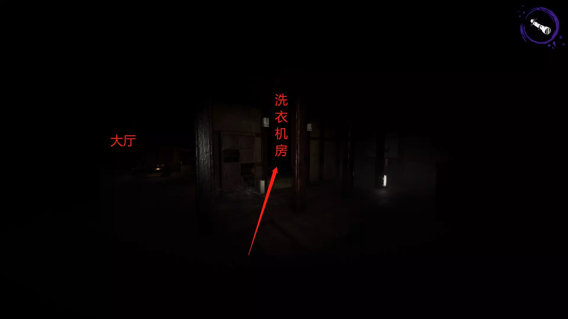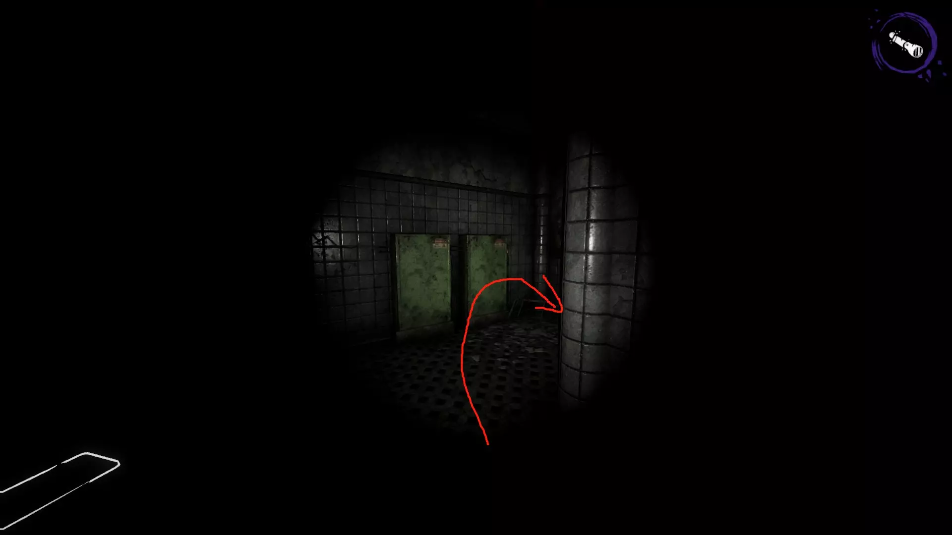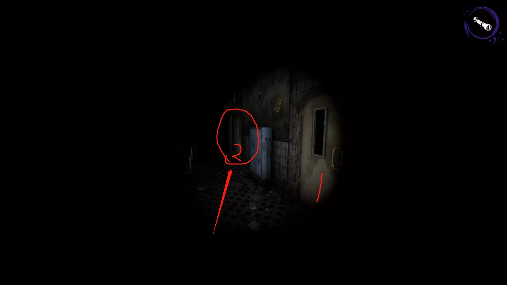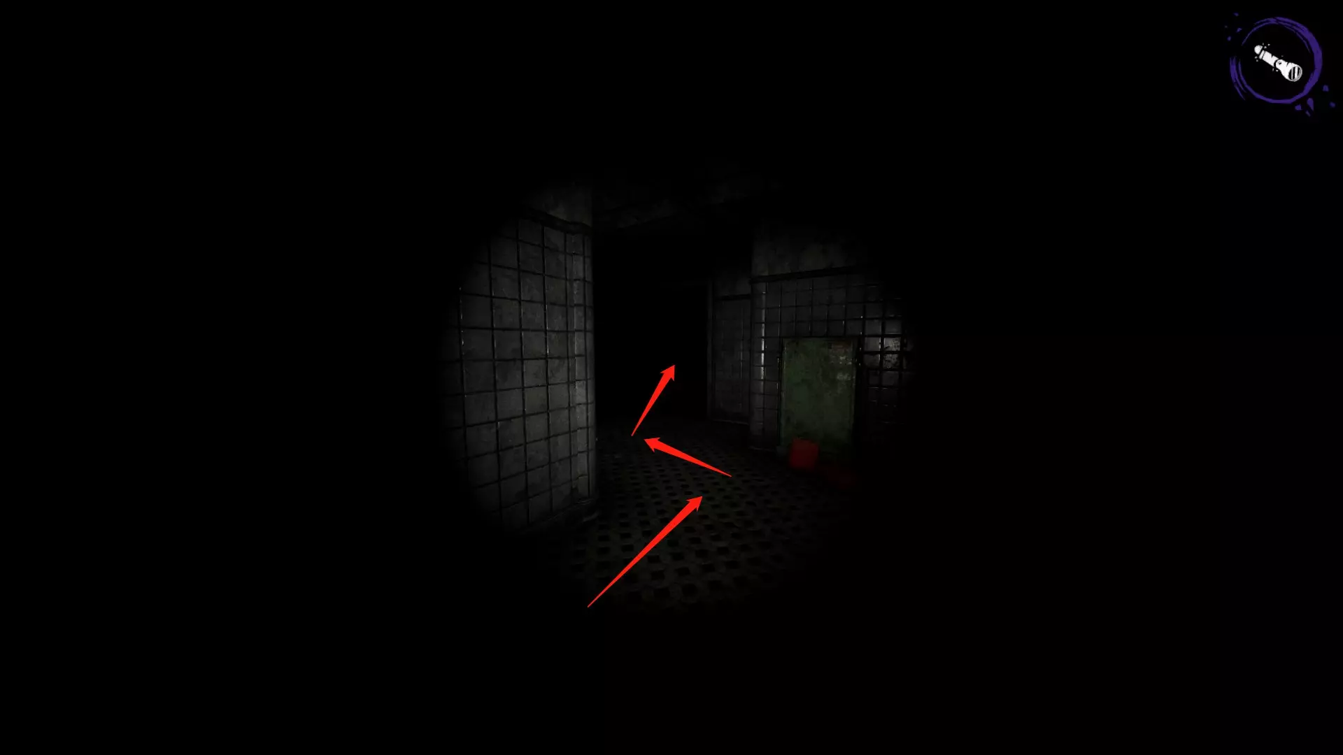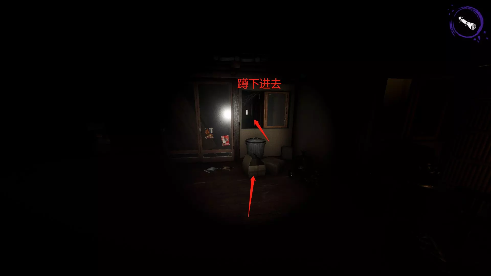 开局后,先打开手电筒,再向右看,那里有一个垃圾桶。垃圾桶下方有个纸盒子,踩着纸盒子跳上垃圾桶,然后按C键蹲下,就能从小窗口进去了。
