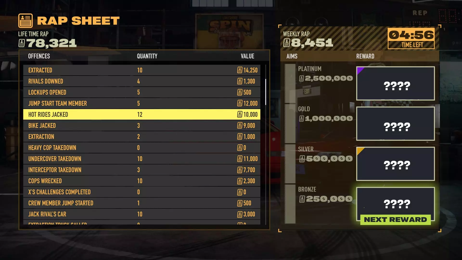 处于【封锁】模式时,你可以按键盘上的Page Down键或手柄上的左十字键来查看所选合约的完成情况。你也可以打开暂停菜单,以追踪队友所选合约的完成进度。队友之间可以为彼此所选合约的目标达成贡献力量。当团队成员开始为您提供帮助时,您会收到通知。而且,您知道吗,我们听说家人就是一切,所以别忘了互相帮助,好吗? 洛克波特传奇:这些载具的设计是为了向传奇的黑名单致敬(除了其中一辆,它比其他所有载具都更“原汁原味”)。问题在于莱克肖尔警方已经将这些车辆没收,并将它们存放在全市各地的隔离区。为了防止车手们猜到它们的位置,警察会不断在隔离区间转移这些车辆。游戏开始时,在你检查隔离区之前,你不会知道里面停放着哪些车辆! 成功撤离所有你找到的黑名单车辆,以便在后续游戏中解锁它们。关注你合约中的【洛克波特传奇】合约进度。完成整个黑名单即可获得全新BMW M3 GTR作为奖励!随着你获取车辆,合约会被标记对勾,无需按顺序完成。 开始吧,笨蛋! 游戏世界 试炼 准备好迎接莱克肖尔最疯狂的试炼吧。X赛车手正在封锁模式下组织比赛,请留意他的参赛邀请。一切都延续了X赛车手的典型风格——他提高了赌注。通过获胜和收集战利品,玩家可以获得丰厚的奖励。所有玩家都能使用追踪道具,这些道具分布在所有赛道的检查点——看来他很享受这场角逐,或者类似的事情!你参与“封锁”模式的时间越长,风险与回报的比例就越高。参与比赛将获得更高的报酬,但随着路线上危险区域的扩大,会出现越来越多的敌人。再加上众多一心想不惜一切代价消灭你的敌对队伍,整个游戏过程会变得相当紧张刺激!但这不仅仅是比赛,车手X在湖岸的挑战中创下了多项个人纪录,所以一定要打破它们,向他展示你的实力!
