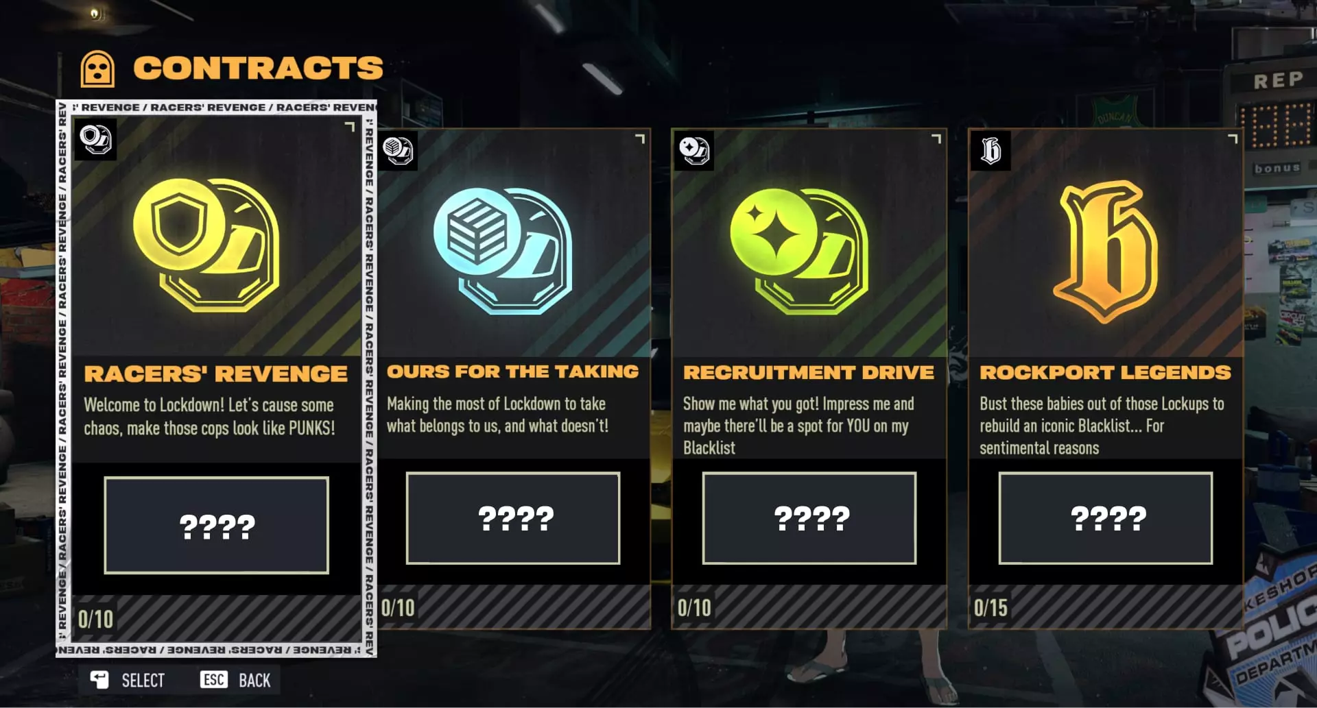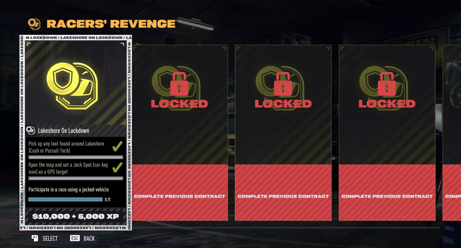 【合约】 合约是由X信使提供的一系列任务,需要在【封锁区】内完成。队友可以通过执行必要操作来互相协助完成所选合约,因此请了解团队的合约内容,并思考如何提供帮助! 合约分为四个章节。在前三个(从X车手开始)任务中,你将与莱克肖尔警察局周旋,并使用【封锁】技能来获取尽可能多的战利品。最后一章【罗克波特传奇】是一个类似贴纸簿的追踪系统,它会显示你已找到并成功扣押的车辆(这些车辆的设计灵感来自《极品飞车:最高通缉》黑名单中的车手座驾)!签订合同以解锁本章车辆序列中的下一辆车。要解锁第二和第三章,需在【封锁】模式中游玩来获取声望。完成合同可获得现金和经验值(XP),同时完成重要合同还会解锁车辆。