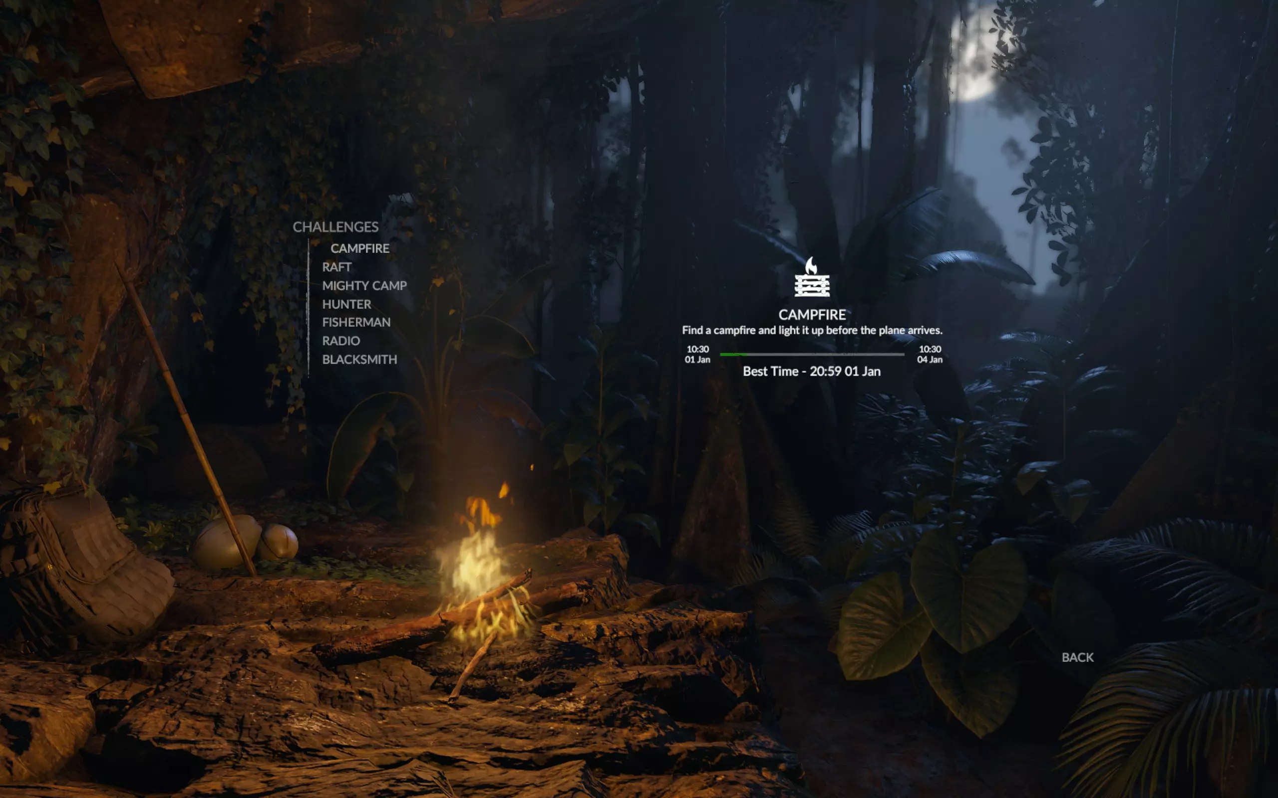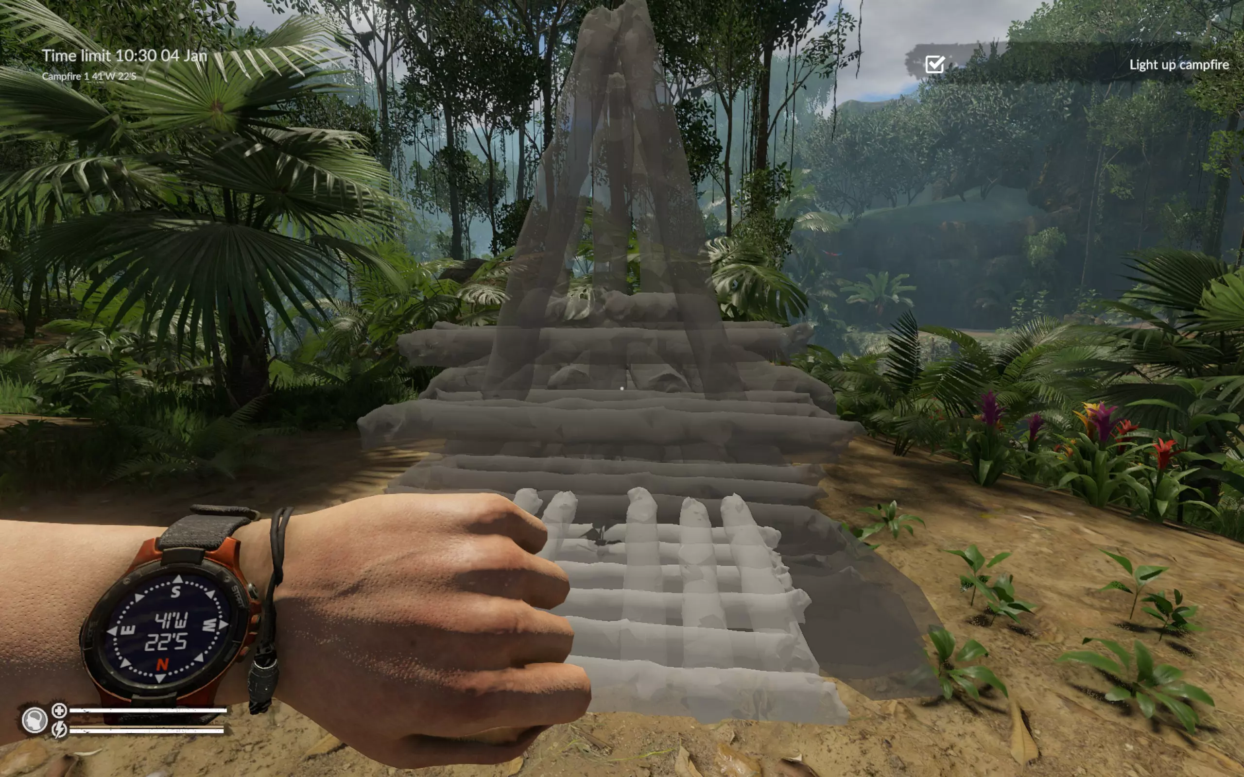 这不是剧情或生存路线中的标准篝火。这是仅存在于该试炼中的独特构造。 我们的任务是收集并点燃这个篝火。为此,需要按以下顺序放置三层原木和两层棕榈叶:11根原木、8片叶子、6根原木、8片叶子、40根原木。树木和棕榈灌木就生长在篝火旁边。我们砍木头,修剪棕榈树,在猴面包树附近砍伐油棕。把木头和树叶搬到模型处,用干燥的棕榈叶来生火。总共需要砍伐29棵树,我为此用了六把石斧。好了,点燃篝火,考验通过。 小建议 不是所有人都记得,木头一次可以携带三根。因此,更高效的做法是直接砍3棵树,或者先砍2棵再砍1棵,然后成三捆搬运木材。 至少要制作2把斧头。你的第一批斧头会非常不耐用(即使在制作斧头之前你已经做了刀、长矛和凿子)。我的第一把斧头只够砍两棵树,第二把也只够砍四棵。因为如果你的斧头坏了,没砍倒的树会很快恢复原状。如果直接把坏掉的斧头换成备用的,砍树速度会更快。 结论 我花了不到12个游戏小时就通过了这个试炼。因此,我不需要任何食物、水、盔甲和辅助建筑(篝火、棚屋、床)。我相信这远不是能达到的最佳成绩。具体来说,在这次游戏流程中,我制作了一把长矛但没派上用场,收集了蓝蘑菇也没用上,全程只步行不跑步,而且石头的生成位置也不太理想。不过,这就是最终结果。
