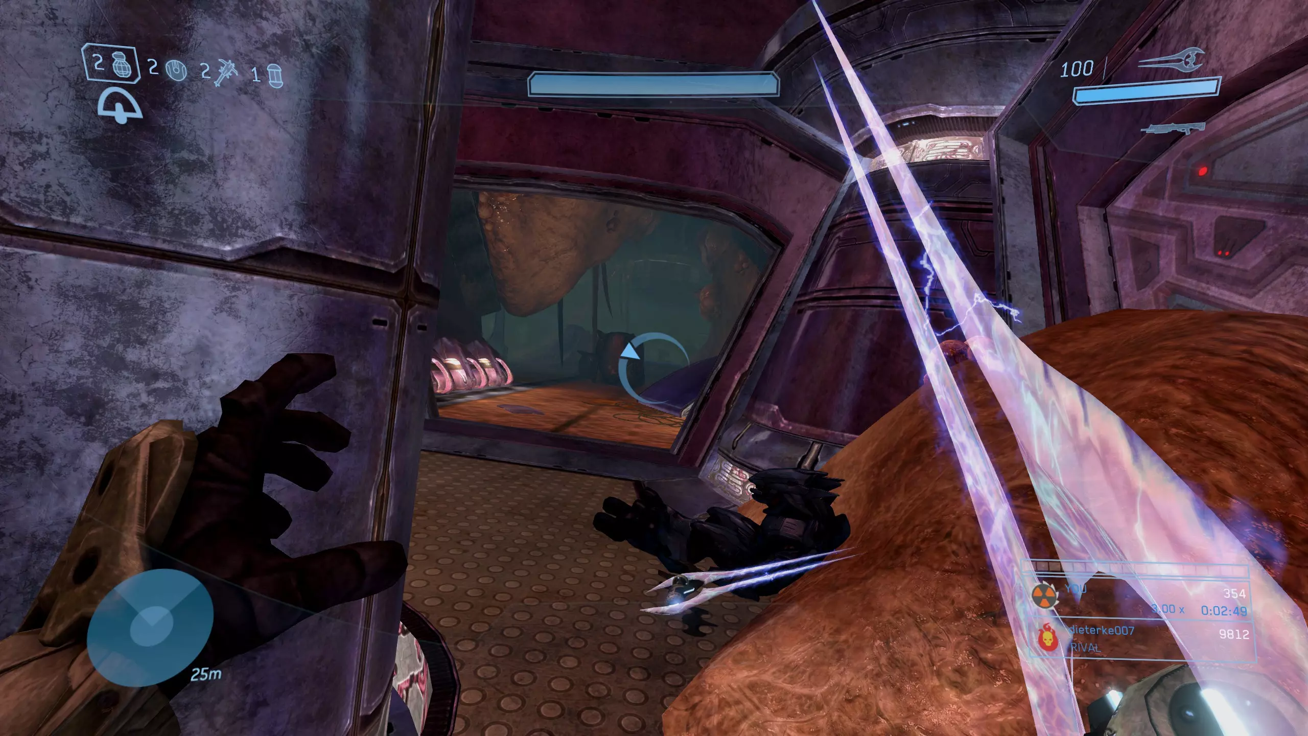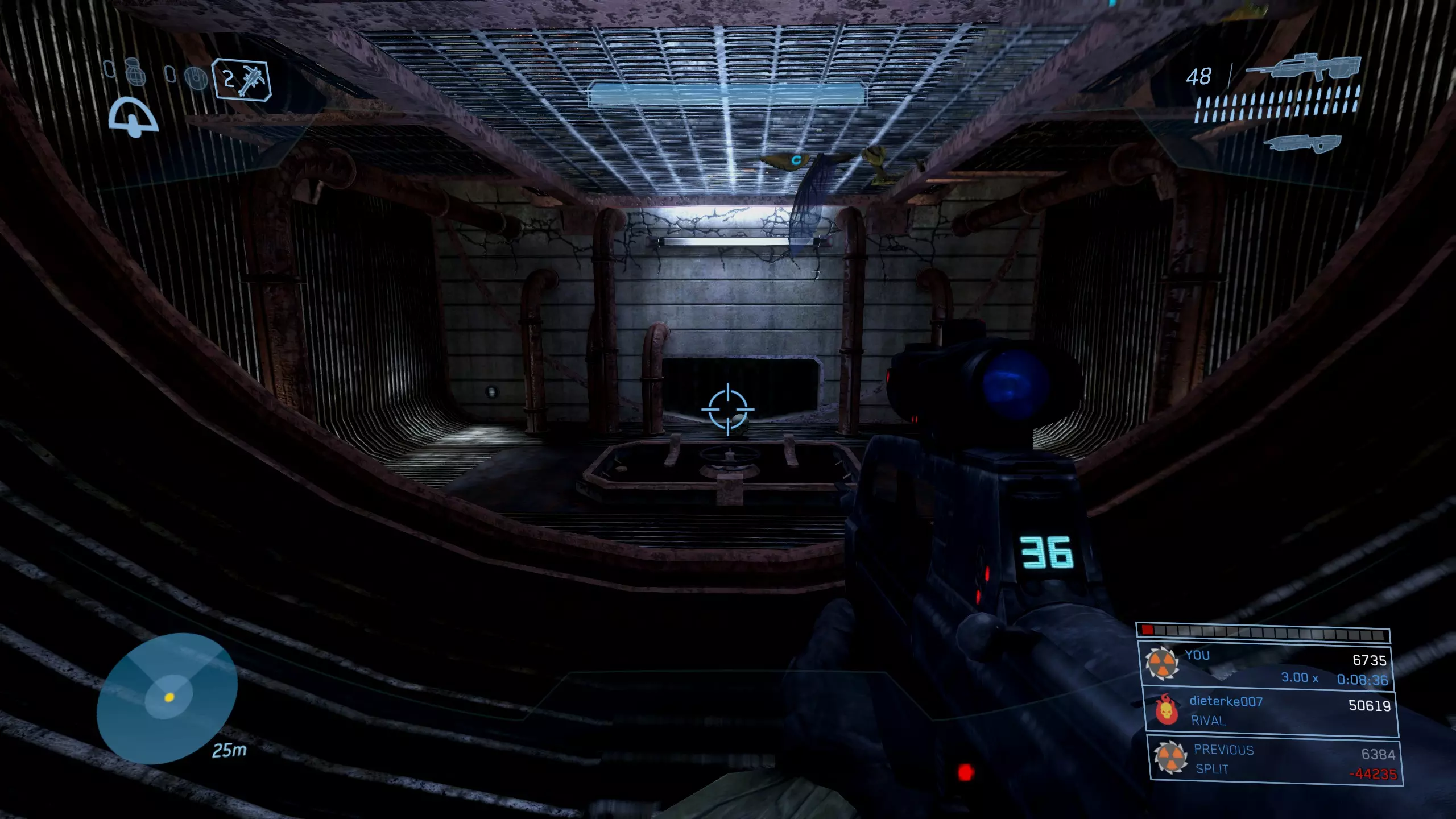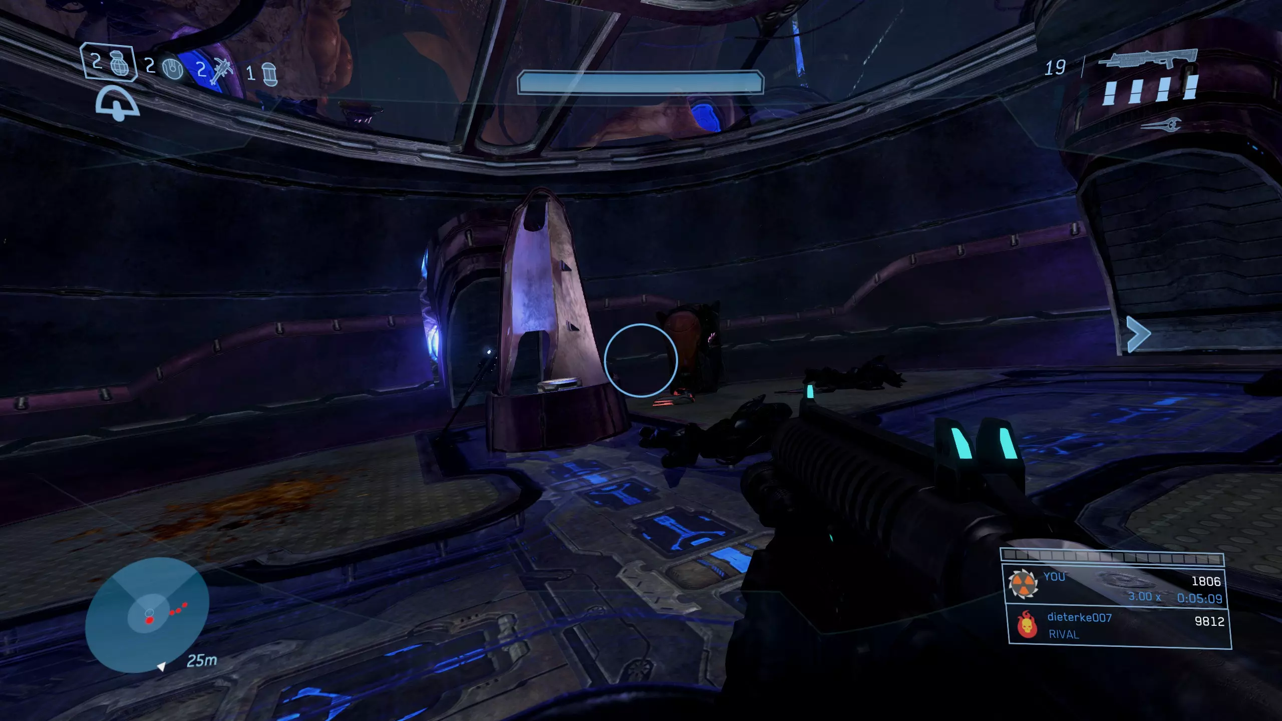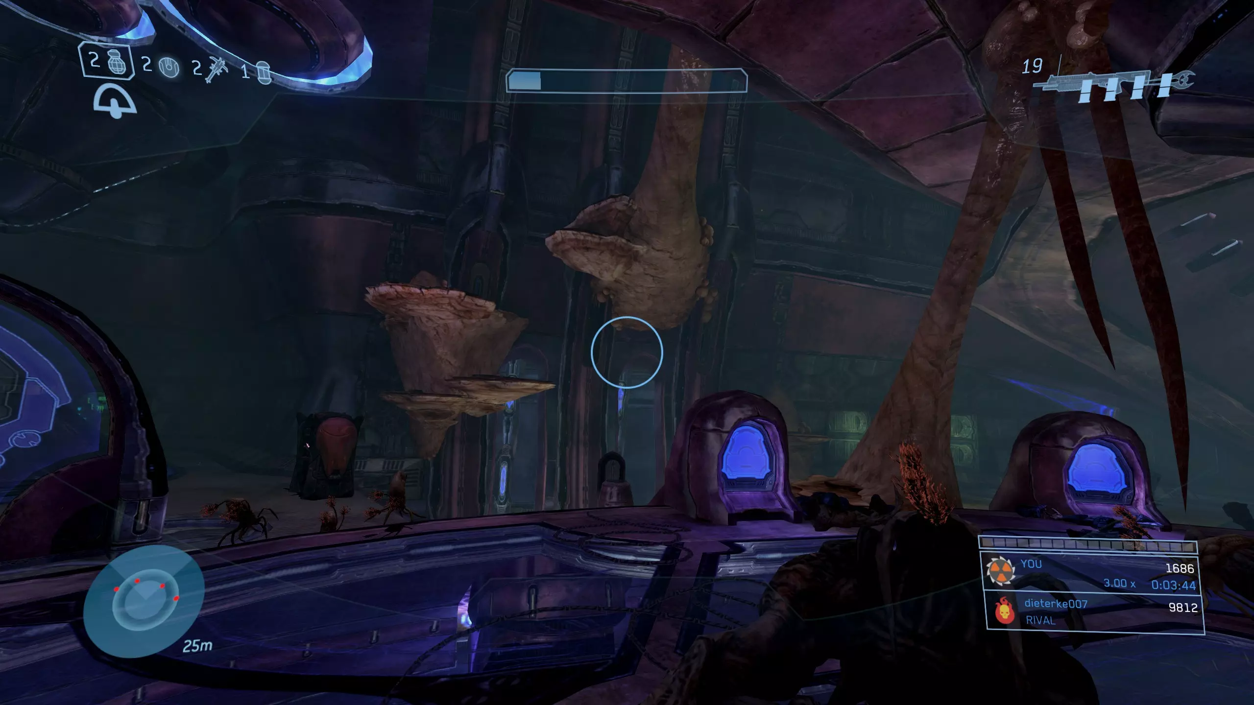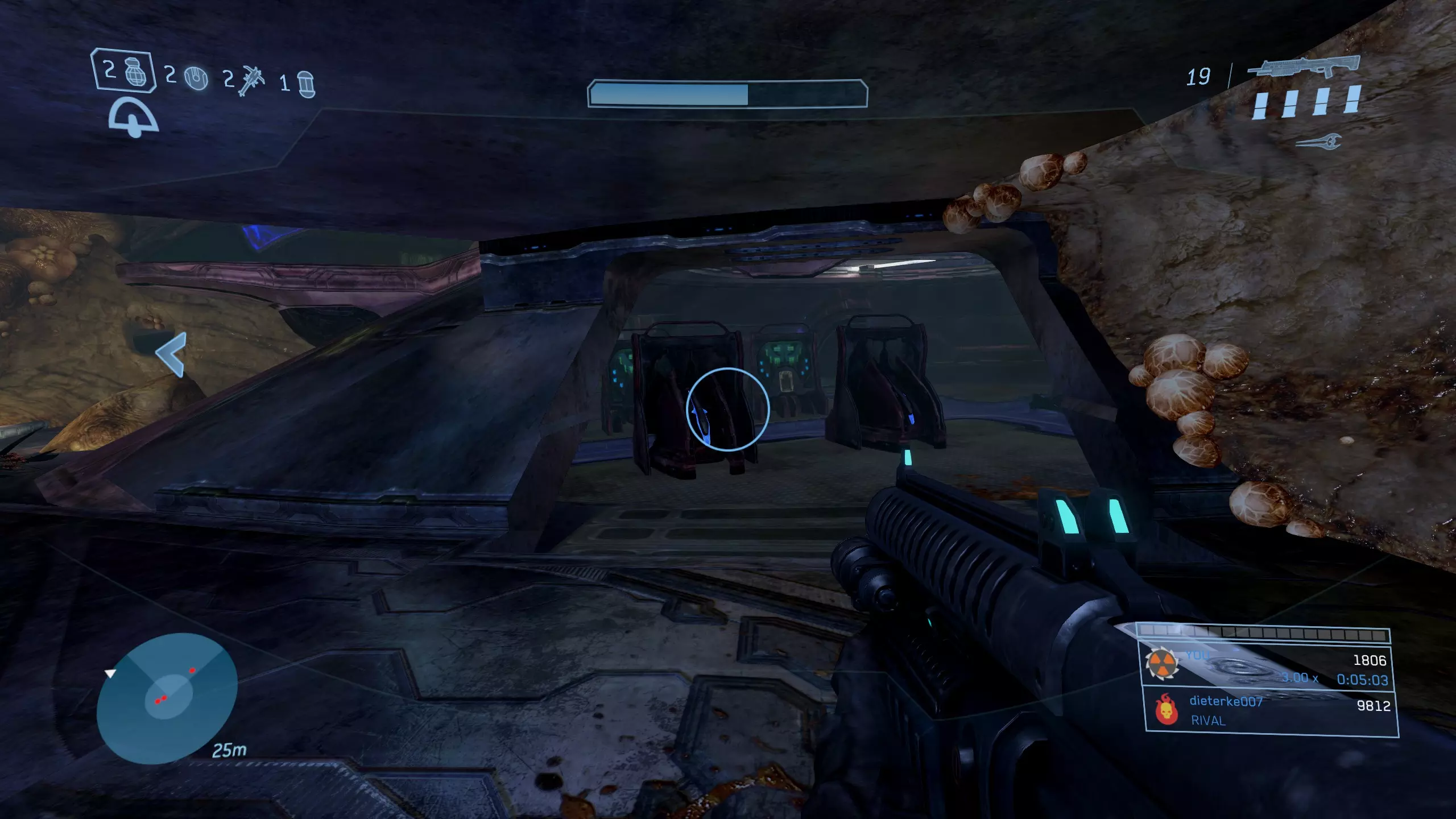 科塔娜 骷髅头12:倾斜 难度要求:普通及以上 效果:敌人的防御抗性和弱点效果翻倍。 位置:在关卡大约三分之一处,你会到达一个大型圆形房间,它最像星盟飞船的内部……或者说剩下的部分。在这个房间里,你需要在左手边墙壁上、上层“甲板”区域旁边寻找类似地衣的生长物。 利用这些地衣生长物作为平台,你可以跳跃并攀爬至房间上方的支撑梁,获取藏在那里的骷髅头。
