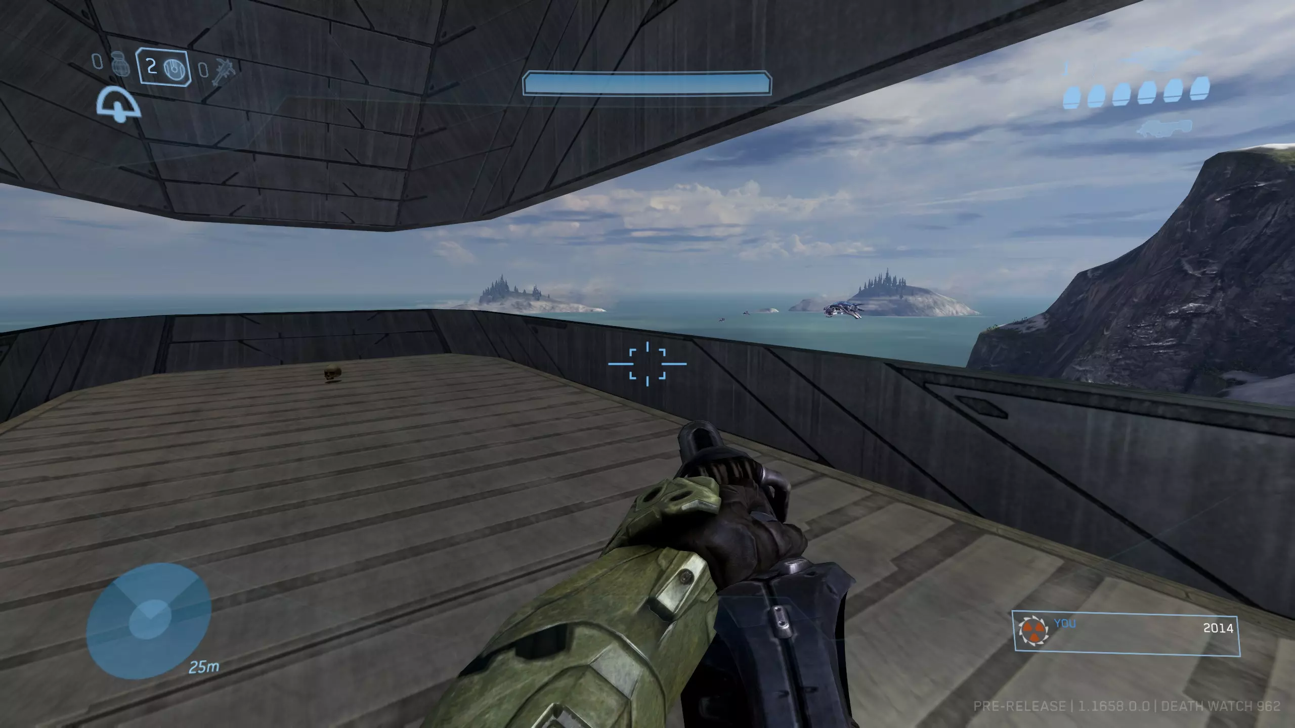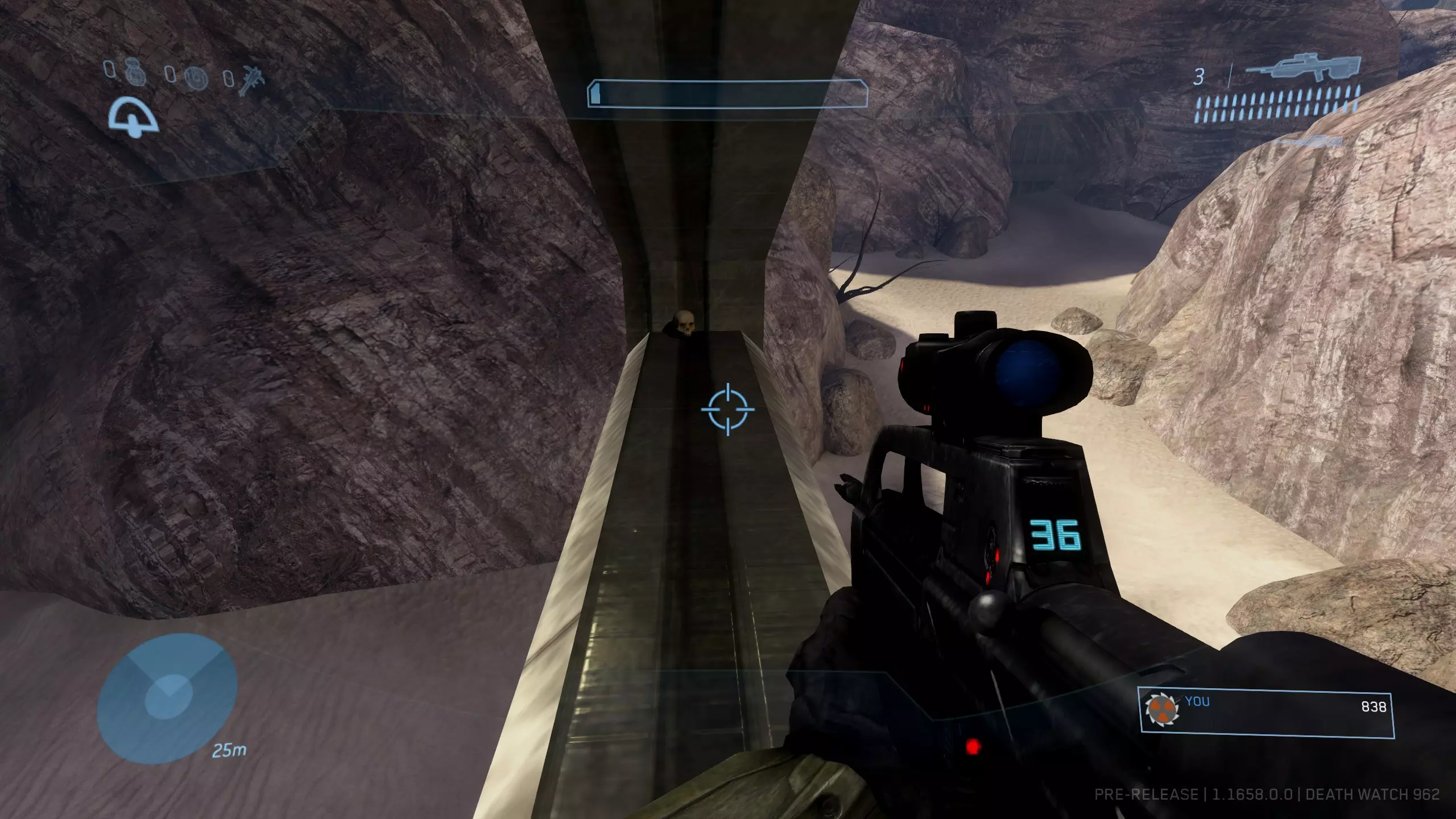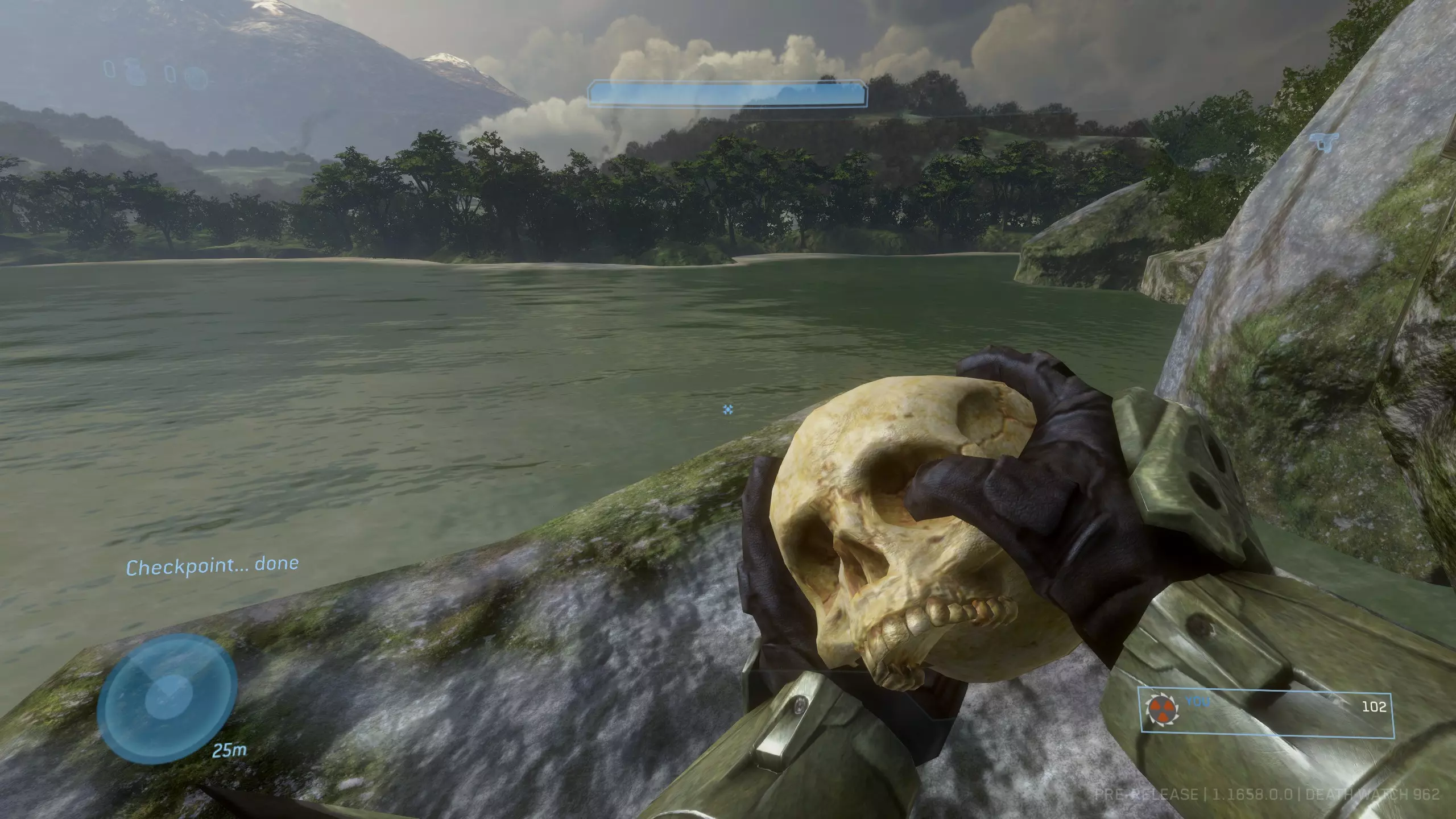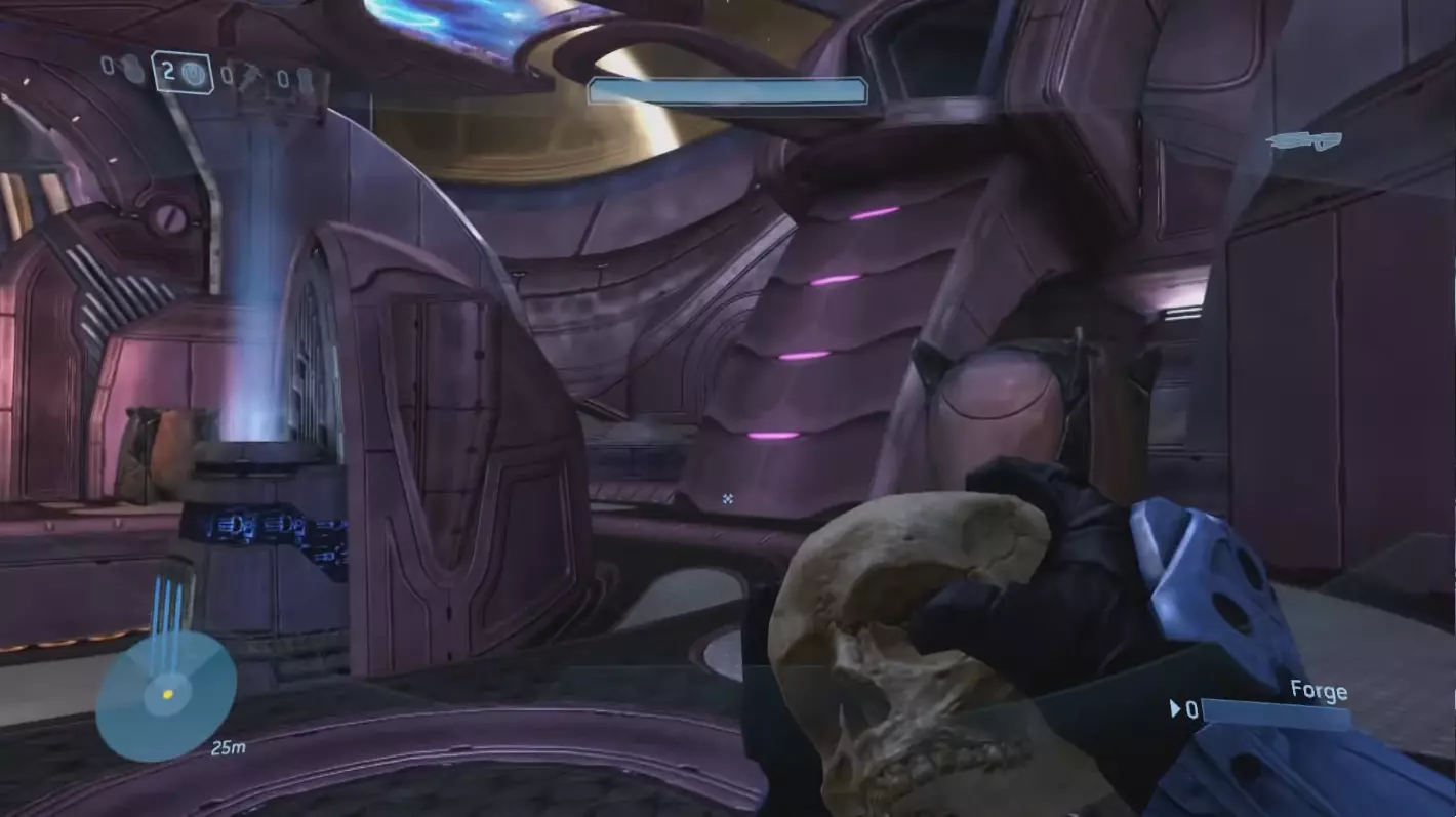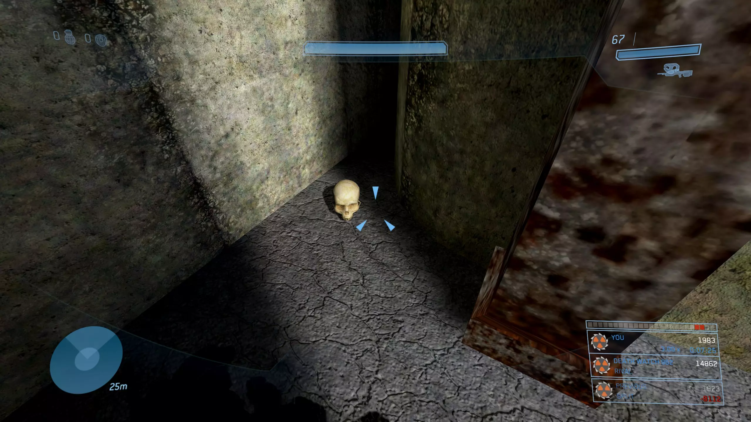 西拉117 骷髅头1:盲目 难度要求:普通及以上 效果:你的整个平视显示器被禁用。你将无法看到你的武器、护盾计量条、运动传感器或弹药/手雷数量。 位置:这个骷髅头非常靠近关卡的起点。从起始位置出发,沿着河流向下游前进,一路消灭三波携带幻影武器的 brute(鬼面兽)和 grunt(咕噜人),直到抵达一个瀑布。当你到达瀑布时,走到悬崖边,沿着边缘向右走。你应该能看到左边有一个较低的平台,骷髅头就明晃晃地放在地上。