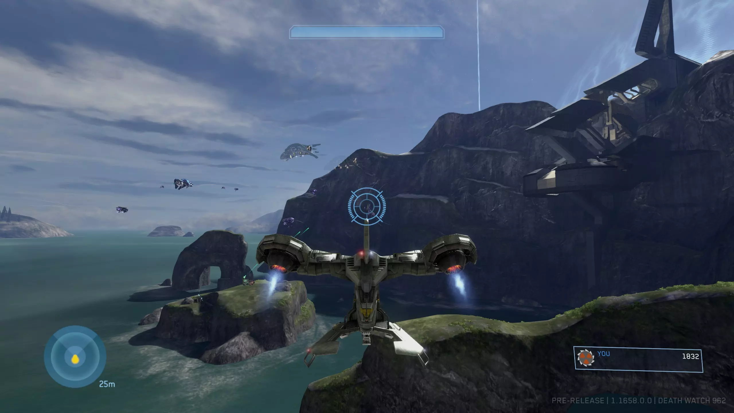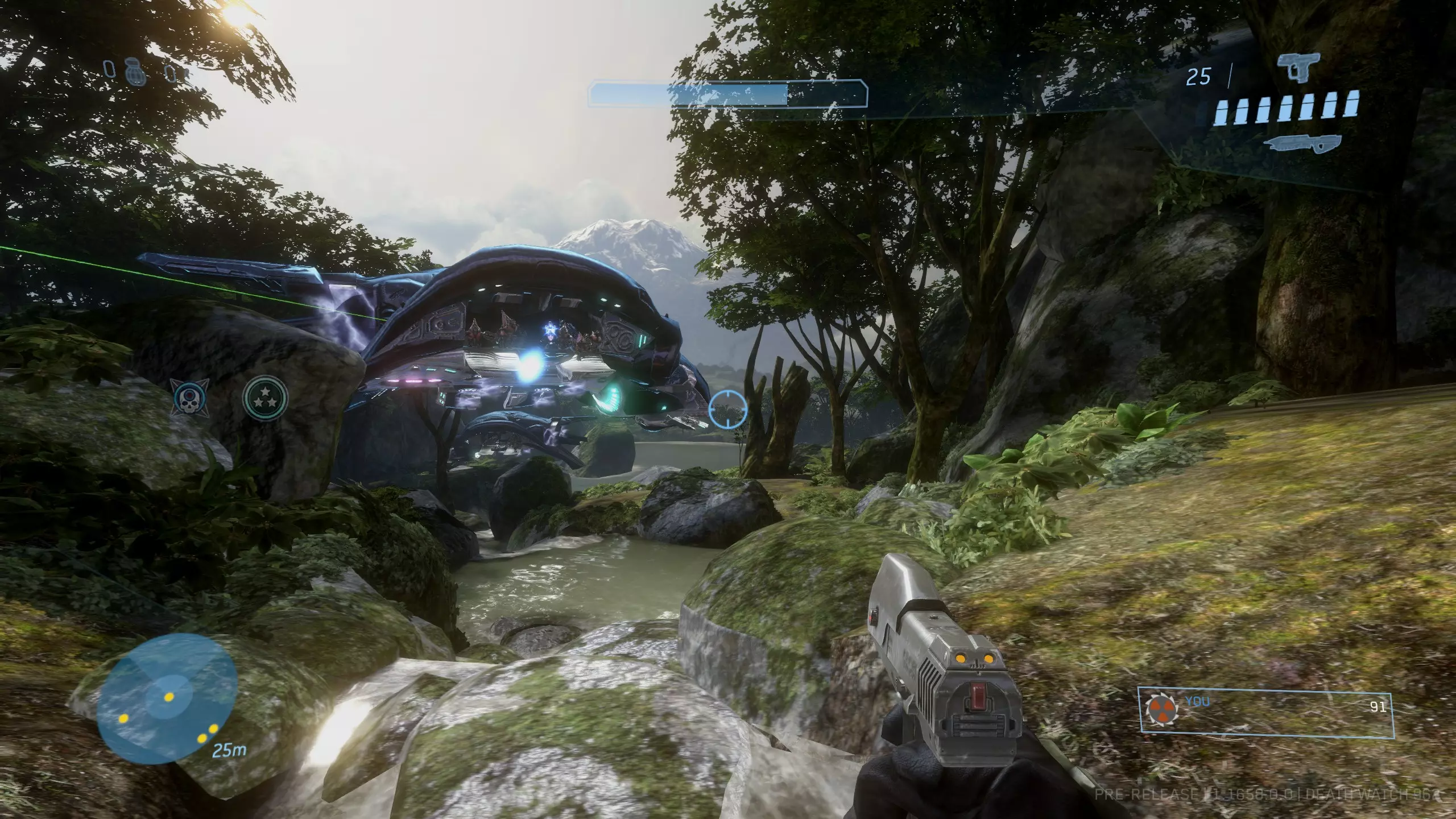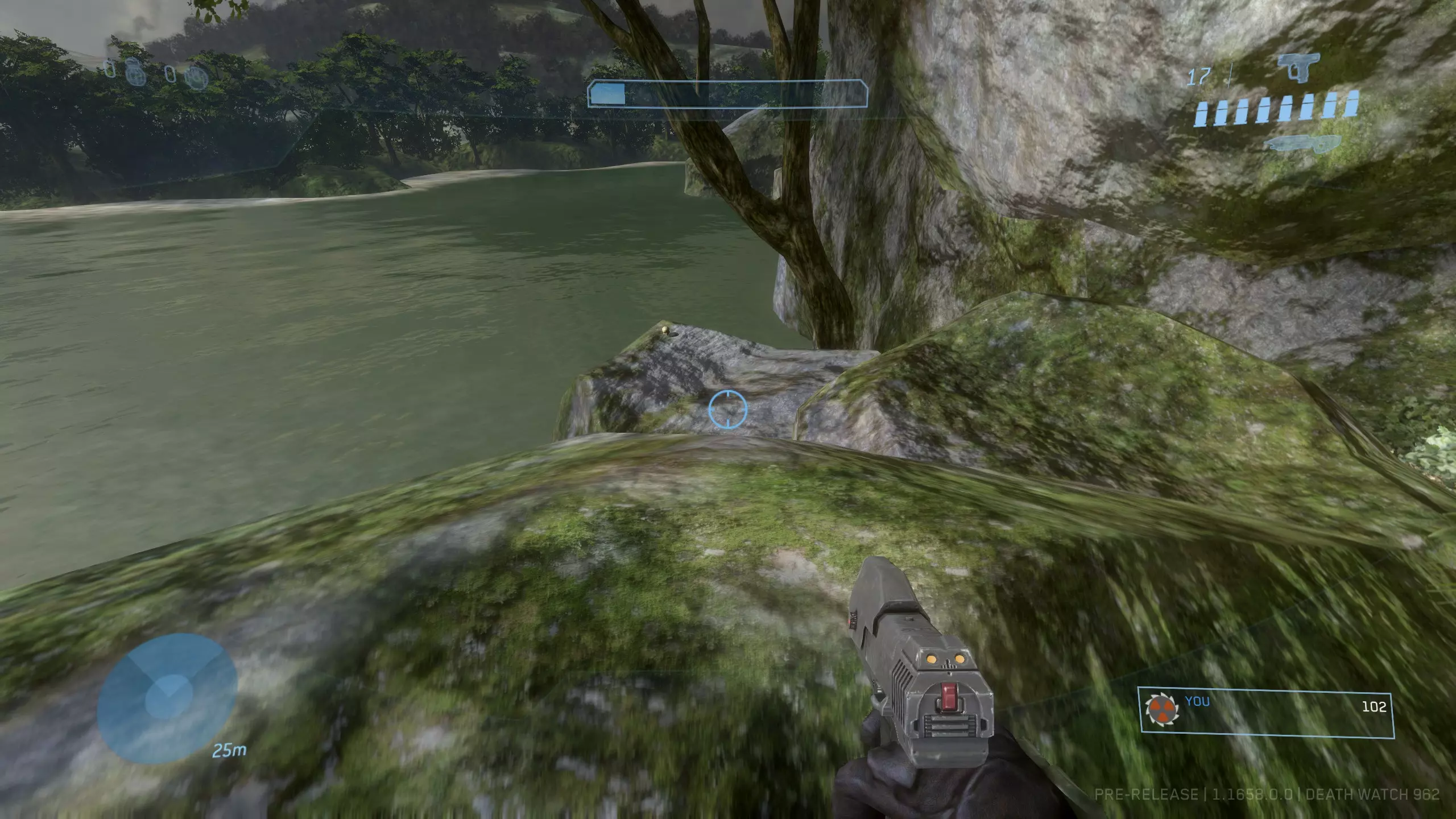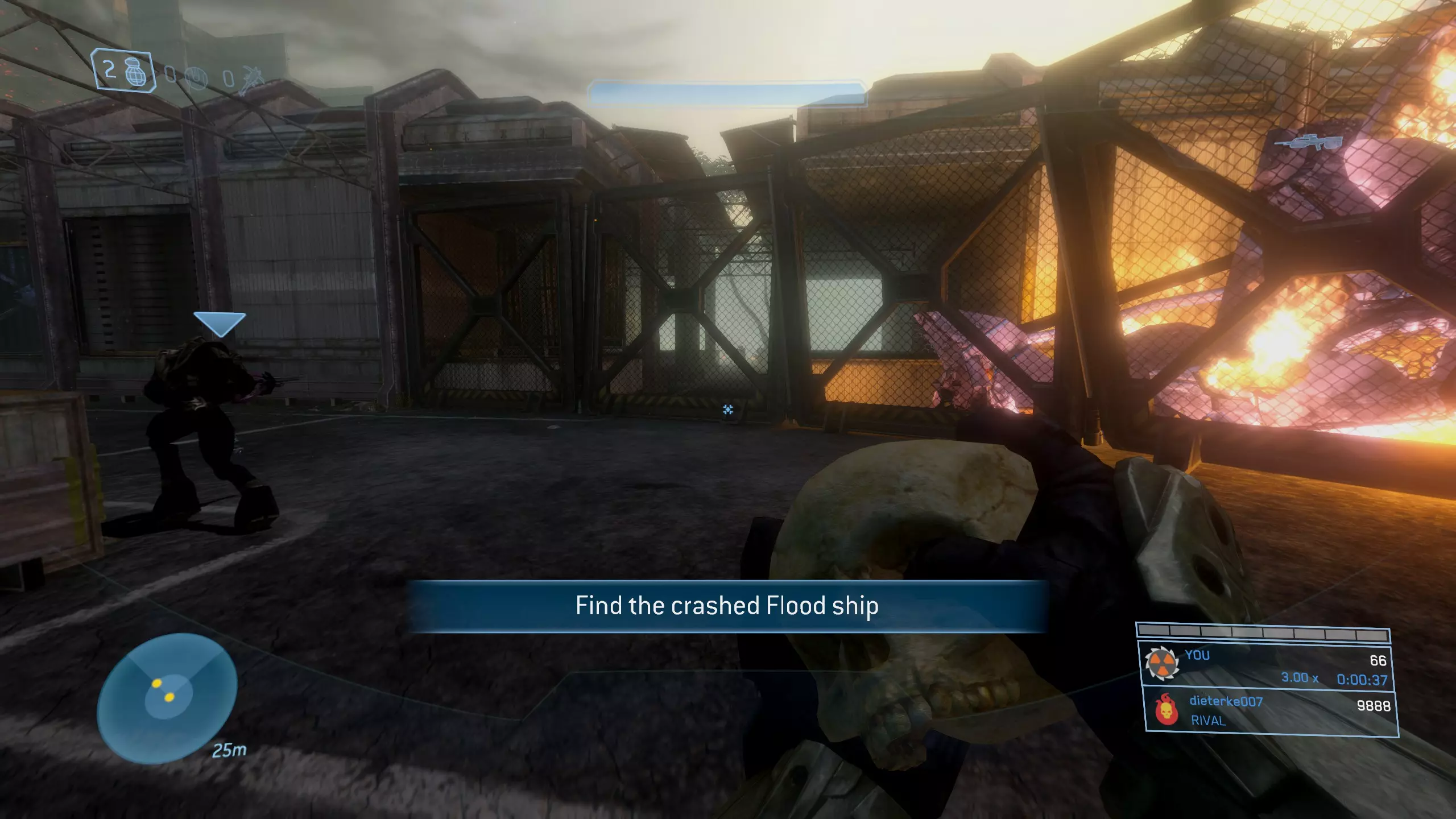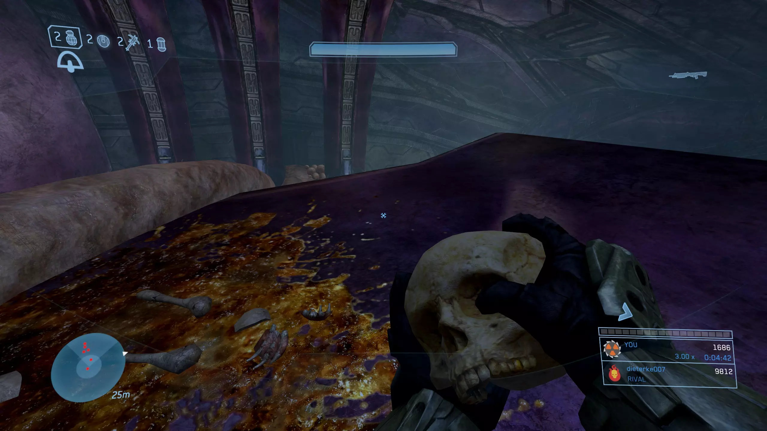 西拉117 骷髅头1:盲目 难度要求:普通及以上 效果:你的整个平视显示器被禁用。你将无法看到你的武器、护盾计量条、运动传感器或弹药/手雷数量。 位置:这个骷髅头非常靠近关卡的起点。从起始位置出发,沿着河流向下游前进,一路消灭三波携带幻影武器的 brute(鬼面兽)和 grunt(咕噜人),直到抵达一个瀑布。当你到达瀑布时,走到悬崖边,沿着边缘向右走。你应该能看到左边有一个较低的平台,骷髅头就明晃晃地放在地上。