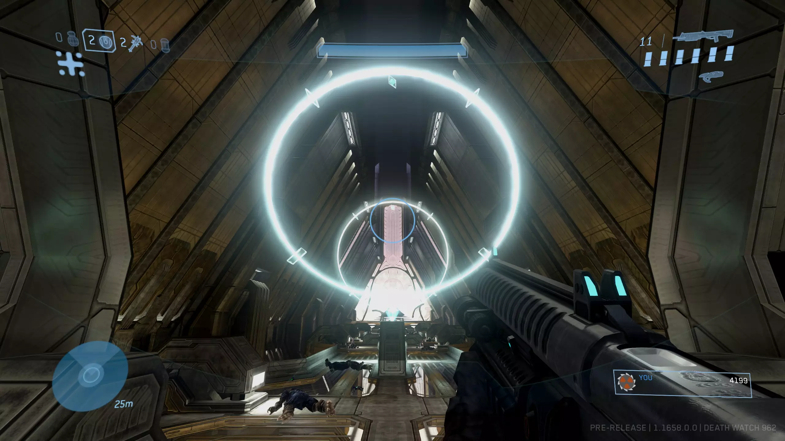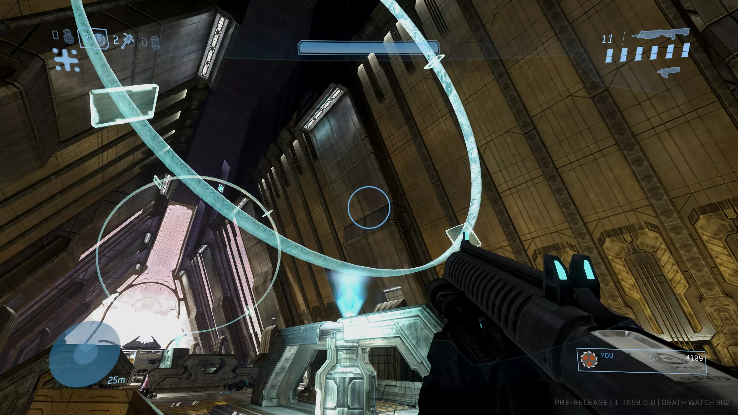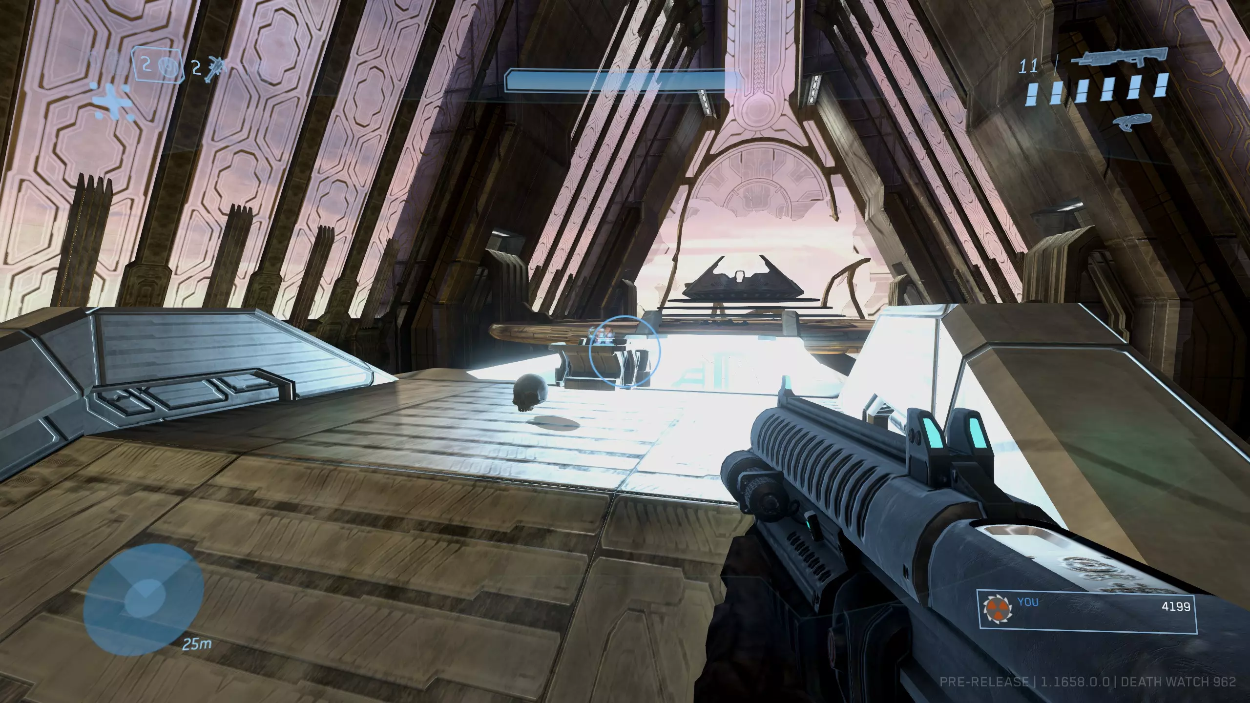 如果操作成功,光环会闪烁。回到有真相先知的平台,你应该能看到骷髅头位于光桥的尽头。如果没有出现,请重试并确保完全穿过光环!需要注意的是,你应该面向真相先知和神庙、背向电梯的方向穿过光环。不过这一点似乎并不绝对。