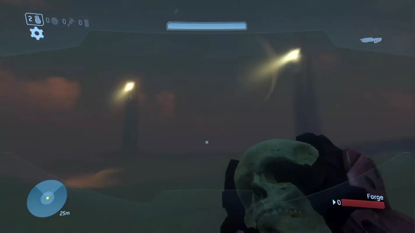 这些骷髅头在你拾取后会添加额外的游戏玩法修饰符;你的唯一奖励是成就。 它们仅在锻造模式中出现。 让我们开始: 骷髅头位于连接外部结构和建筑的两根管道中间。使用锻造编辑模式飞上去拾取它。