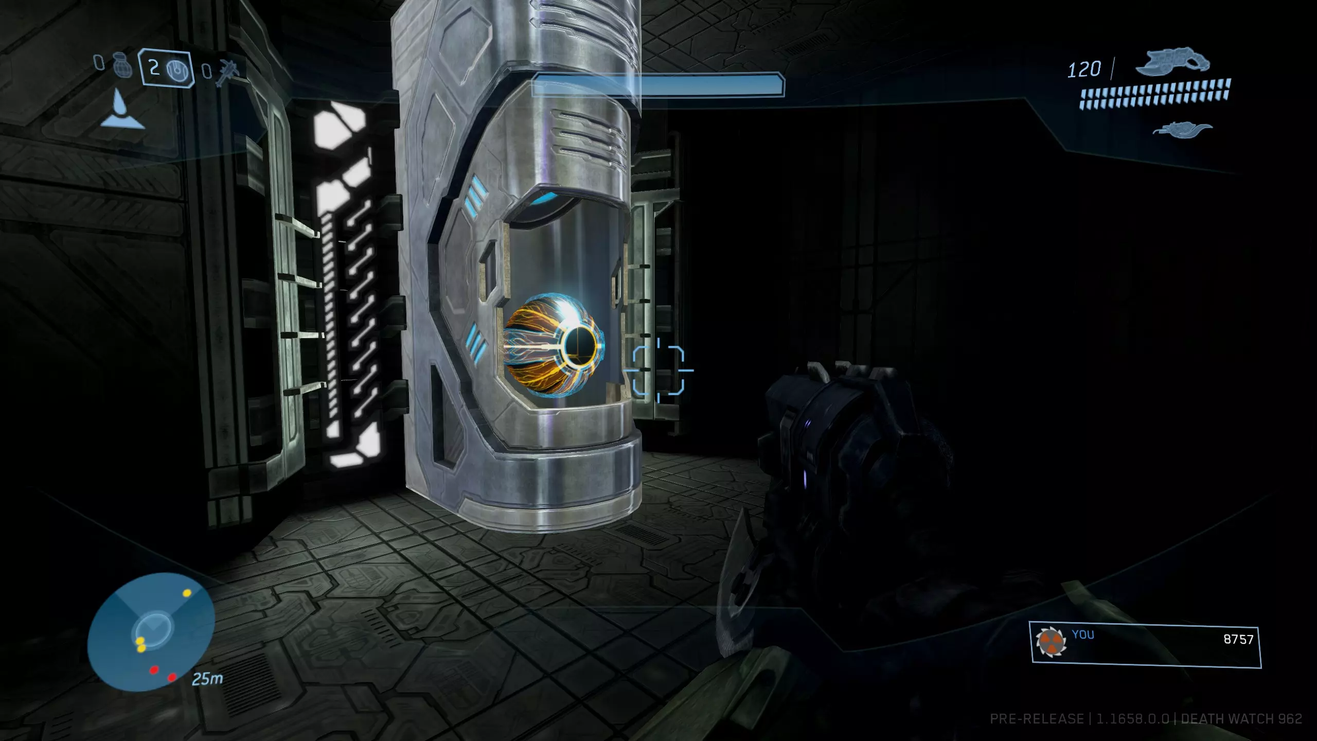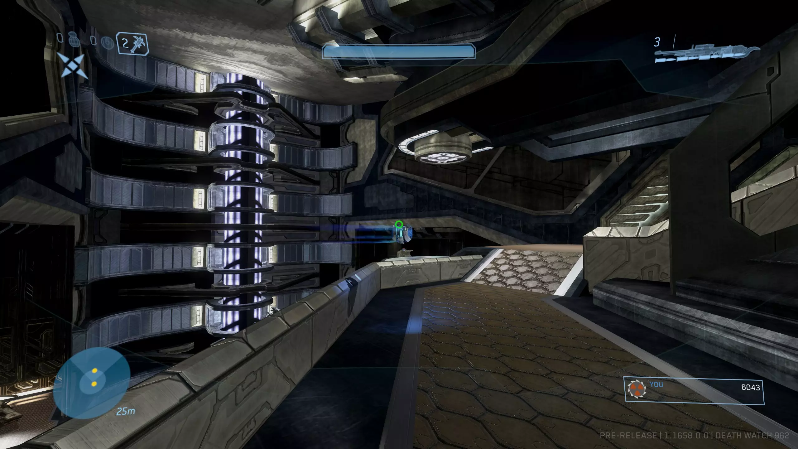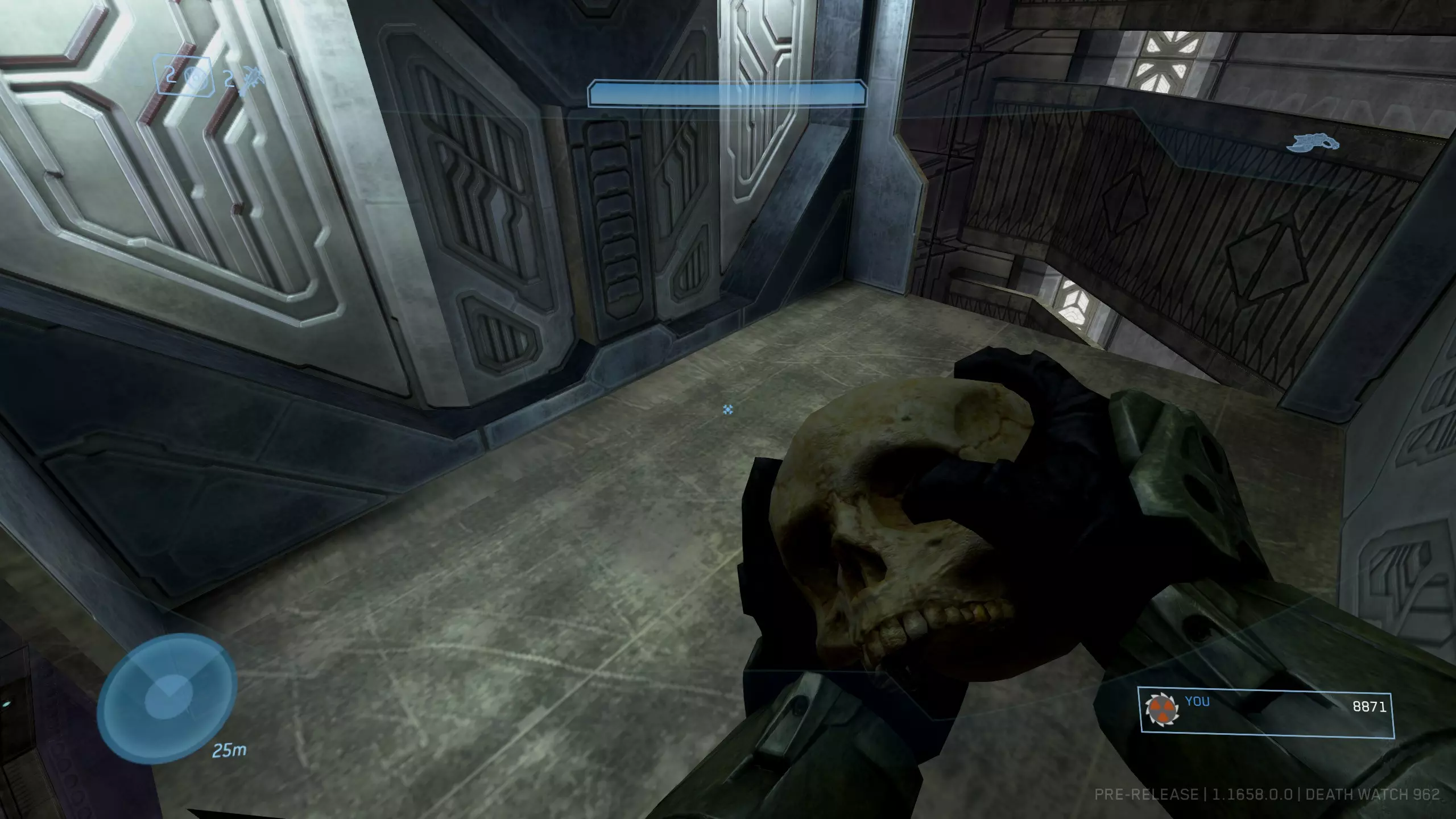 在蓝色区域找到能量护盾,然后寻找带有蓝色三角形图案的墙壁。图案之间应该有一根柱子。在这根柱子的顶部右侧壁龛中就是骷髅头。由于无法使用监视模式跳入,生成一个重力提升装置来弹进去并快速获取骷髅头。