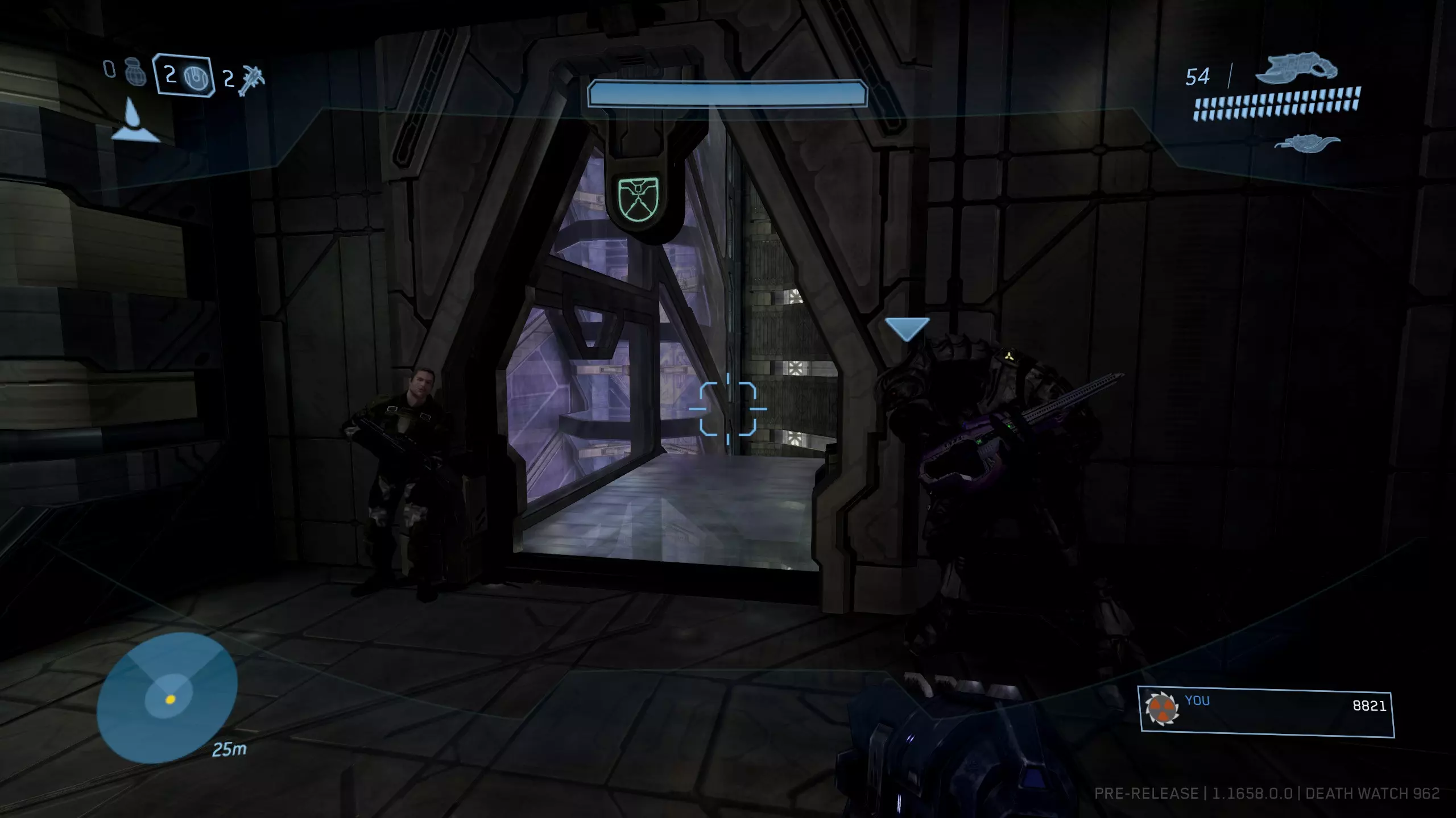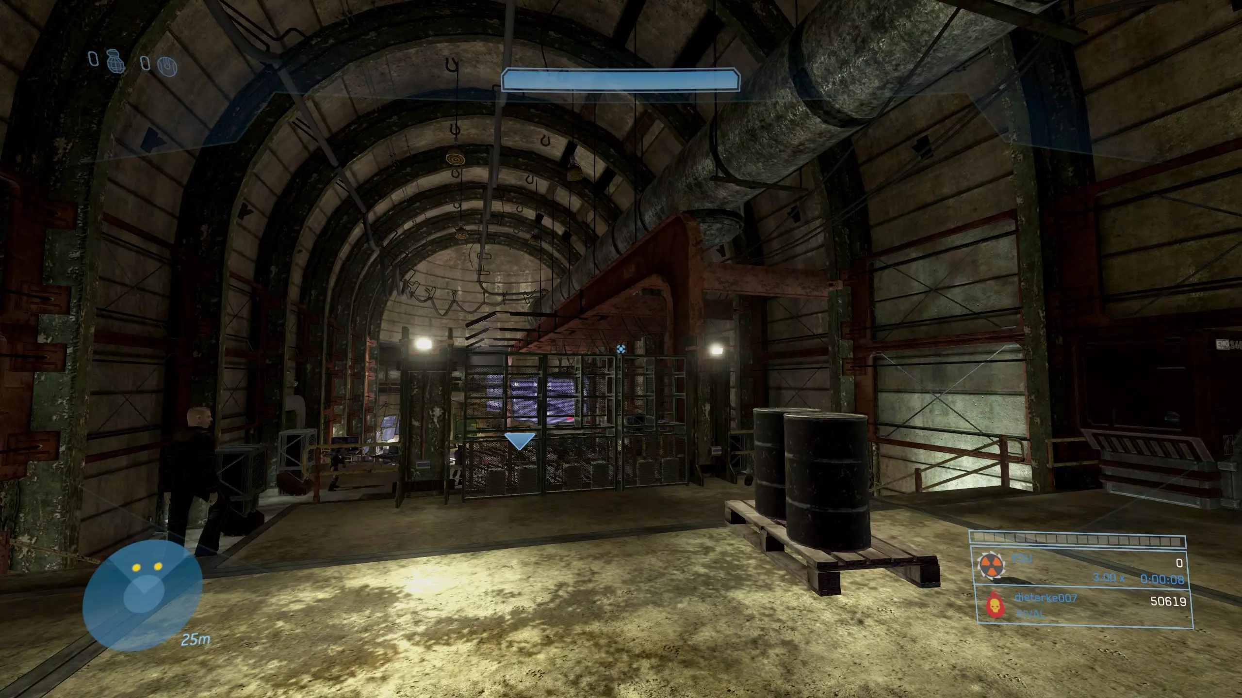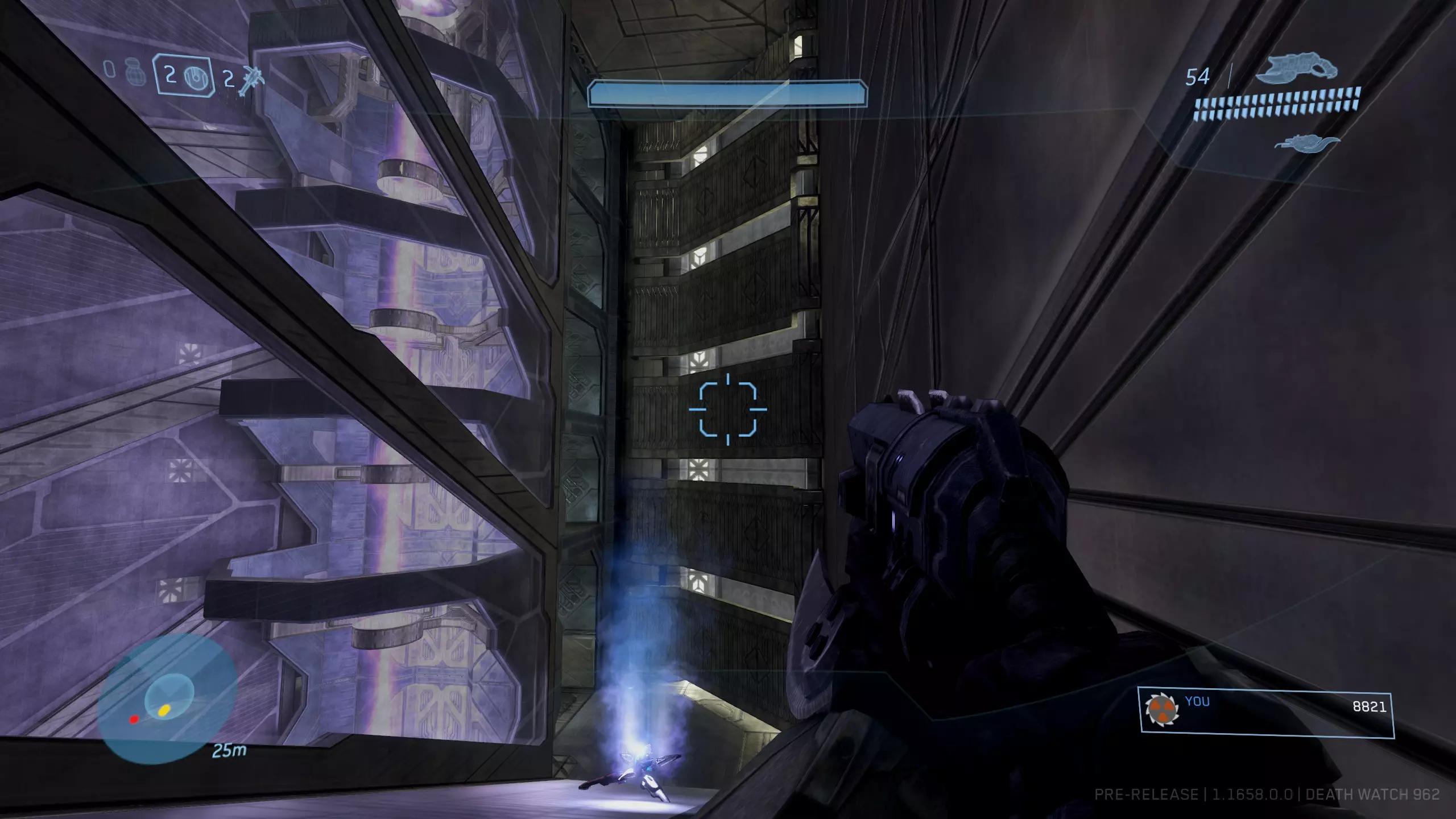 在蓝色区域找到能量护盾,然后寻找带有蓝色三角形图案的墙壁。图案之间应该有一根柱子。在这根柱子的顶部右侧壁龛中就是骷髅头。由于无法使用监视模式跳入,生成一个重力提升装置来弹进去并快速获取骷髅头。
