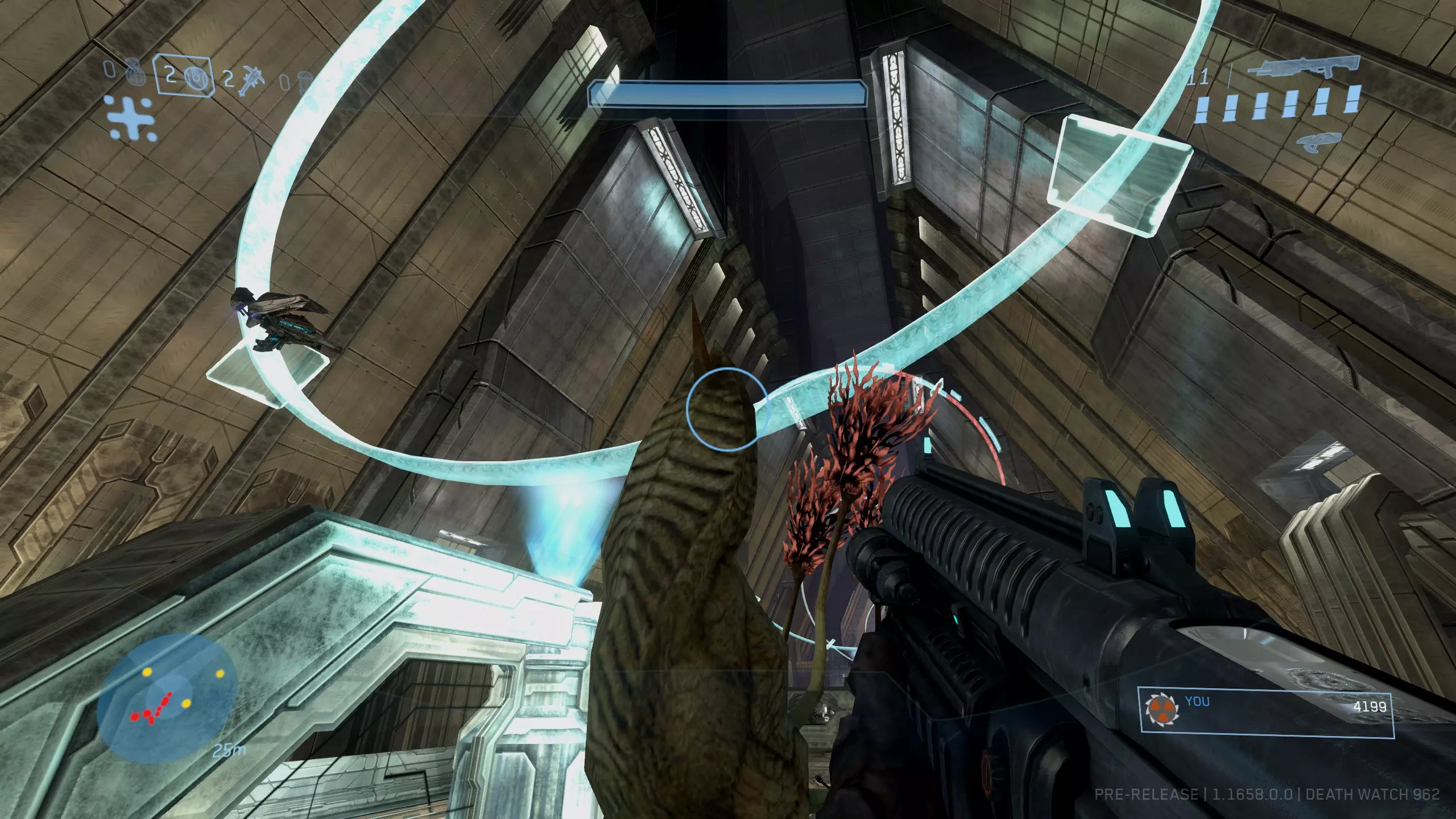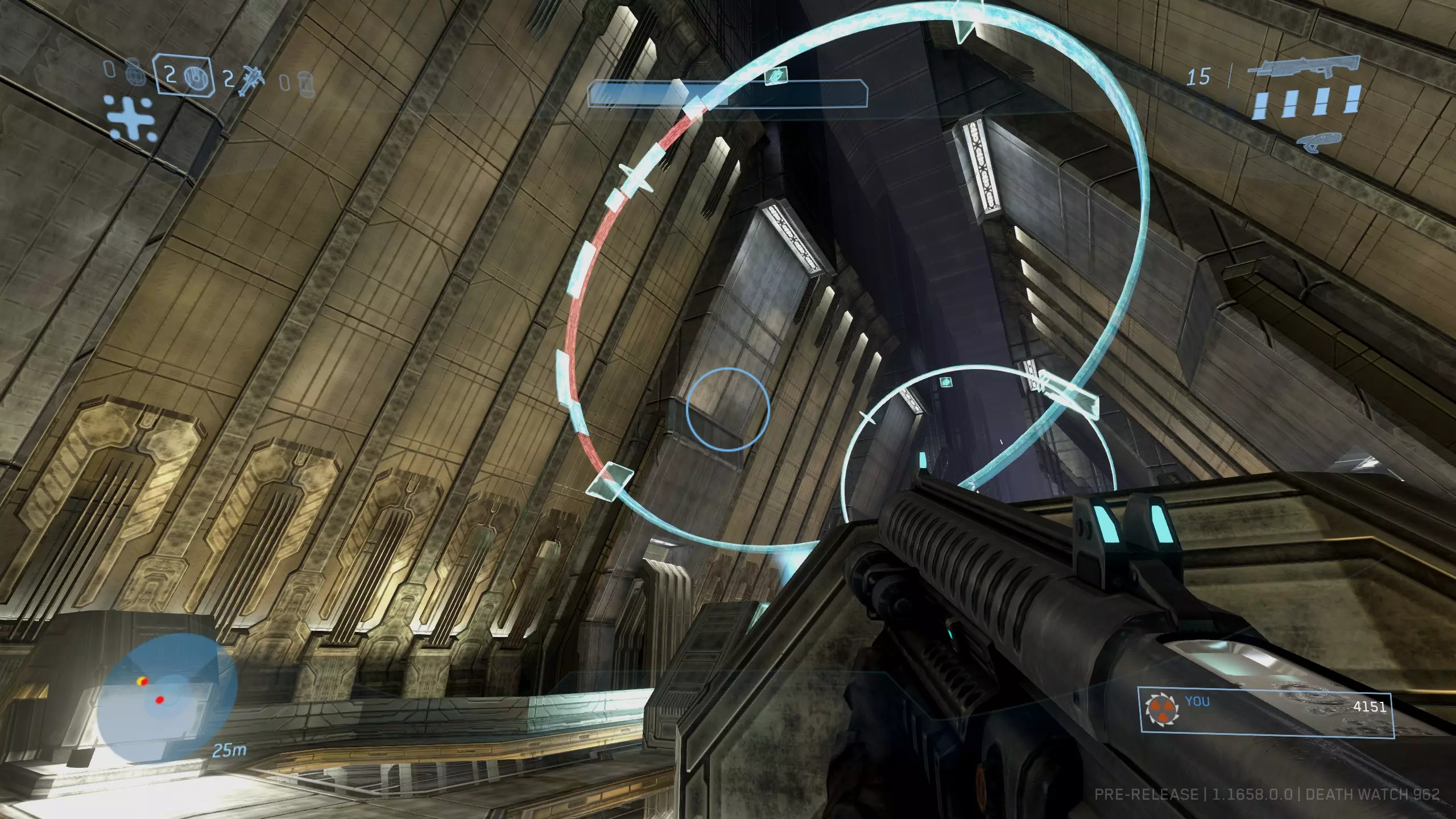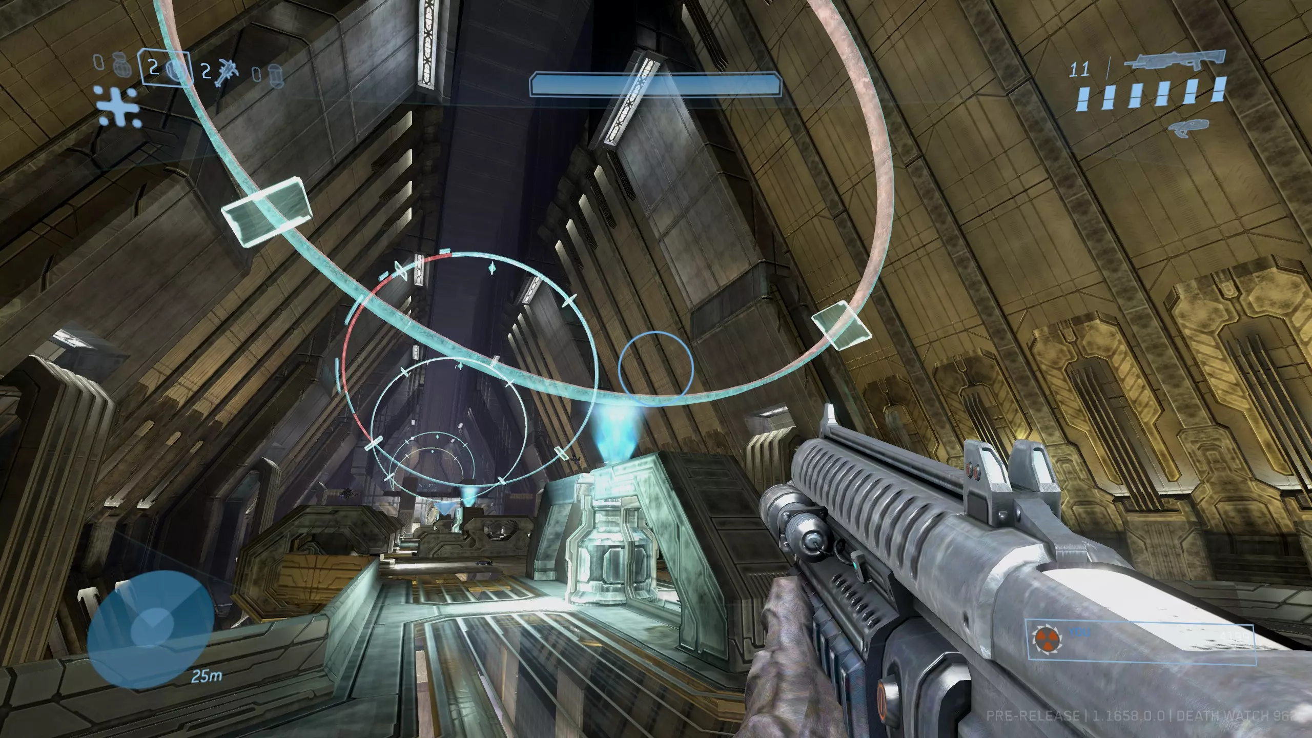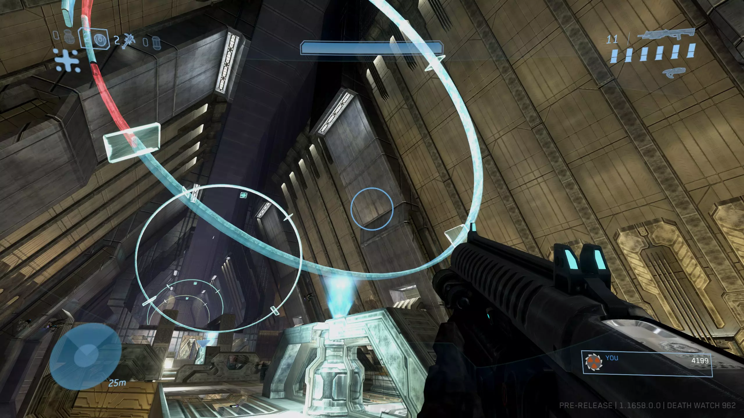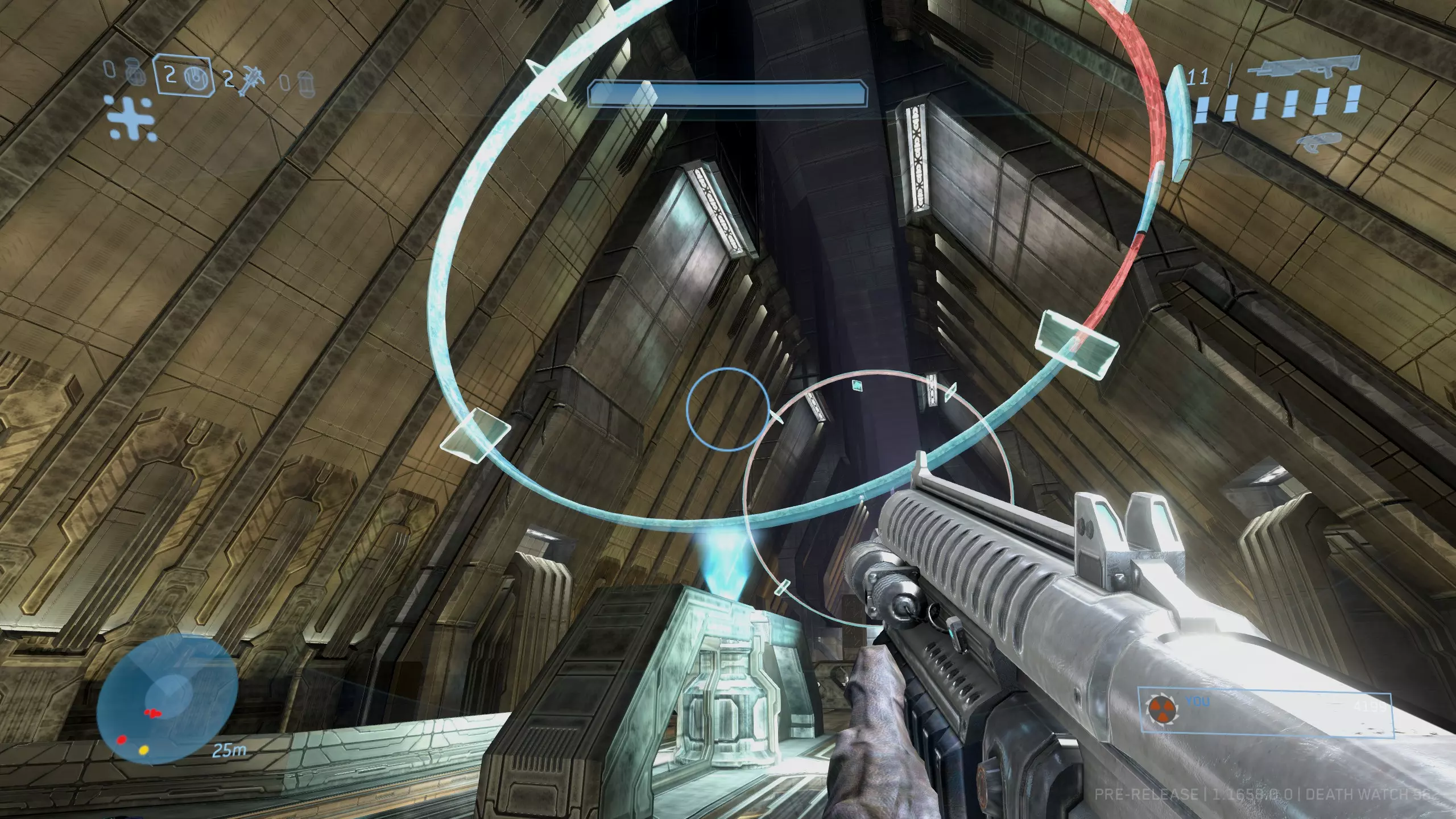 头骨#11:我为什么要这么做 难度要求:普通及以上 效果:解锁AI的新对话,通常带有幽默风格 位置:与《光环2》中的同名头骨类似,“我为什么要这么做”头骨是目前最难获取的。要找到它,在我们得知真相先知的命运后,需要清理房间内所有洪魔。虽然并非必须,但这样会让后续操作简单很多。 在从电梯延伸至整个圣殿房间的上方,一直到你遭遇真相先知的位置,你会看到一系列悬浮的发光蓝色圆环。 总共有七个圆环。离电梯最近的圆环为1号,离真相先知所在的光桥最近的为7号,其中有三分之一为红色的圆环是4号。你需要按正确顺序依次穿过这些圆环。所需顺序如下:4、6、5、4、5、3、4。 [图片顺序从左到右]