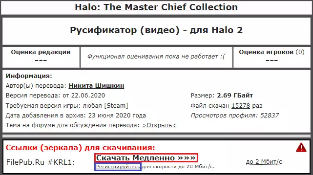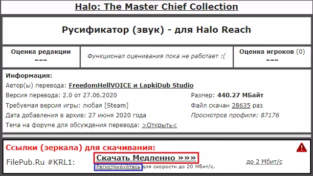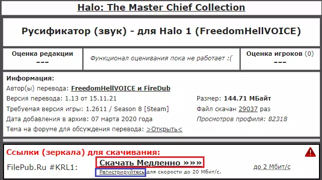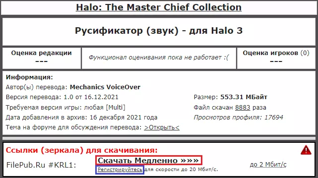 示例/俄语配音公告 俄语配音演示 我们致力于制作本地化补丁 负责人 - spider91 翻译 - "ОРЕОЛ"团队 技术部分 - spider91 音频处理 - Екатерина Дмитрова 测试 - spider91、Екатерина Дмитрова和 Давид Якимов 编辑与排版 - "ОРЕОЛ"团队、Halo Universe和spider91 配音角色:士官长(配音:Петр Гланц) 科塔娜(配音:Екатерина Дмитрова) 343罪恶火花(配音:Дмитрий Дробница) 中士潜行者(配音:康斯坦丁·阿列克谢耶夫) 中士雷诺兹(配音:斯塔斯·奥列伊尼科夫) 墓地心智(配音:谢尔盖·沃罗比约夫) 中士约翰逊(配音:叶夫根尼·伊万诺夫) UFO突击队员(配音:亚历山大·汉斯) 拉斯·瓦杜姆(配音:尼古拉·沙布内维奇) 真理先知(配音:谢尔盖·奇哈切夫) 米兰达(配音:叶卡捷琳娜·卢先科) 胡德勋爵(配音:瓦西里·季图宁) 仲裁者(配音:罗曼·沃尔科夫) 霍库斯(配音:安娜·钦佐娃) 赫留基(配音:阿尔乔姆)【莫尔佩霍配音】:维塔利克·卡舍瓦罗夫、伊万·索尔达坚科夫、奥列格·阿布杜纳扎罗夫、列昂尼德·马卡罗夫、伊万·萨沃斯金、亚历山大·汉斯、安德烈·马斯洛夫、谢尔盖·科普京、鲁塔·尼亚季耶娃、奥列格·纳扎罗夫、丹尼斯·斯特罗耶夫、安娜·钦佐娃、雷吉娜·罗伊兹、伊利亚·哈伊科 【飞行员配音】:伊万·索尔达坚科夫、列昂尼德·马卡罗夫、斯塔斯·奥列伊尼科夫、尤利娅·希什金娜、阿尔乔姆·切尔诺夫、奥列格·纳扎罗夫 【布鲁托配音】:德米特里·兹韦列夫、瓦列里·科兹洛夫、伊万·萨沃斯金、奥列格·纳扎罗夫 【平民配音】:伊万参与配音:尤利娅·索尔达坚科娃、奥列格·希什金娜、埃利托夫·纳扎罗夫、德米特里·祖巴列夫、伊万·萨沃斯金、“OREOL”团队、罗曼·马卡罗夫、大卫·亚基莫夫、Makarov-B312、Nate Archer、VeMars、阿纳斯塔西娅·布柳翁科娃、谢尔盖·斯捷潘诺夫 【光环宇宙】俄语配音由Freedom Hell VOICE提供 本地化补丁简要说明: 光环版本:截至2023年7月12日 多人游戏与合作模式:正常运行 成就:正常运行 文本与字幕:未翻译 安装方式:自动安装当前更新指南时的汉化补丁状态:无法使用。 关于《光环3:地狱伞兵》的Freedom Hell Voice汉化补丁:这是一个不错且唯一的《光环3:地狱伞兵》汉化补丁,其中也翻译了萨迪的故事。 “个人意见”:虽然我还没玩完《光环3:地狱伞兵》,但根据其他汉化补丁的经验以及对该补丁的初步了解,它做得很好。(稍后我会在使用该配音通关《光环3:地狱伞兵》后补充本部分内容)。哪里可以下载?方案一(ZoG):Zone of Games(《光环3:地狱伞兵》)。进入Zone of Games网站,向下滚动一点后点击下载,但如果您对下载速度不满意,可以点击下方的注册按钮并填写表单进行网站注册。