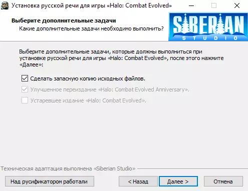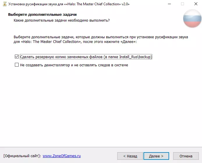 2е) 可根据个人意愿选择是否制作原始语音文件的【备份】和【卸载程序】(建议都制作),这是为了在您对该俄语化补丁不满意并想要删除时,借助【卸载程序】和【备份】能轻松恢复游戏的原始文件。
