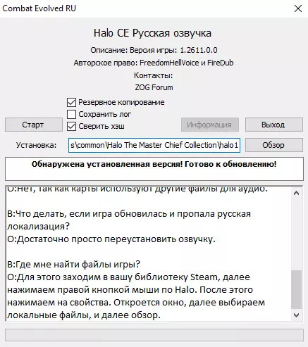 第二个选项(Yandex磁盘)我想这里不需要说明,通过下方链接下载该语音包。 由“Freedom Hell Voice”制作的语音包(适用于《光环:战斗进化》) 第三个选项(Steam创意工坊)即将推出 Freedom Hell Voice为《光环:战斗进化》制作的本地化补丁安装说明 这里需要您手动操作一下。 1)指定游戏路径,因为安装程序无法自动找到游戏。如果游戏在C盘,路径为:C: Program Files (x86) Steam steamapps common Halo The Master Chief Collection halo1 如果游戏不在C盘,例如在D盘,路径为:D: .. SteamLibrary steamapps common Halo The Master Chief Collection halo1 2е) 决定是否制作【备份】(备份副本)、是否校验【哈希值】、是否保存【日志】。 简要说明这些功能: 备份:如果之后想要卸载汉化补丁,就需要备份。 哈希值校验:检查所有文件是否正常安装。日志保存:创建安装过程的详细报告。