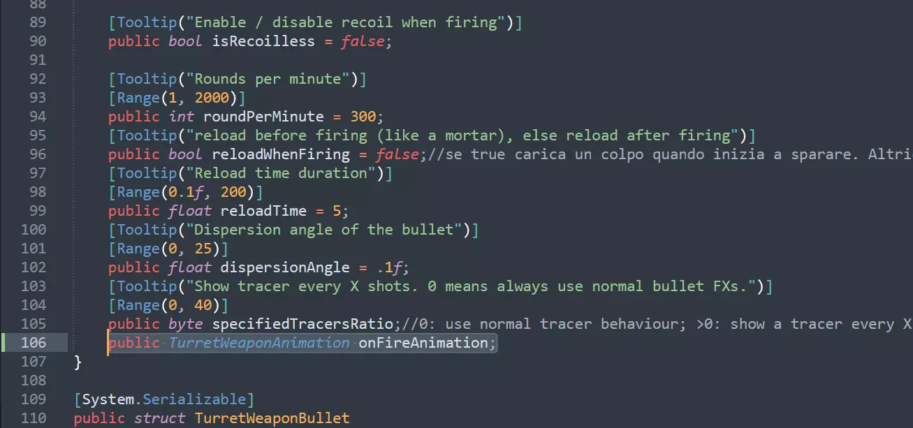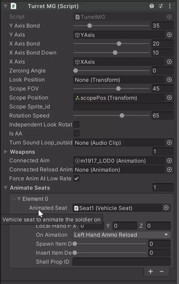 角色动画 据我所知,你无法在装填期间为角色动作制作动画,这些动画是根据你选择的座位动画器预先确定的(例如,OnVehicleSeat_MG_1会让角色做出打开顶盖并插入弹带的手部动作,而OnVehicleSeat_Pak40_user则会让角色做出取出并插入新炮弹的动作,即使你的炮塔本身尚未制作动画)。要激活这些动画,只需在【Animate Seats】数组中添加一个新元素,然后将你希望制作动画的座位对象拖放进去。我不太确定【On Aimation selector】的作用,不过我推测它与【Shell Prop ID】字段有关,炮弹会跟随左手、右手或不跟随任何一只手。为了利用原版游戏的腰带/弹匣动画系统,你需要对SDK中的现有脚本进行一些修改,并添加几个新脚本。 首先,打开Assets ER2 SDK Scripts ER2 Components Veichles TurretGun.cs脚本,在TurretWeapon类中插入以下代码行:public TurretWeaponAnimation onFireAnimation; 由于在原版脚本中,它位于specifiedTracersRatio之后,我是这样插入的: