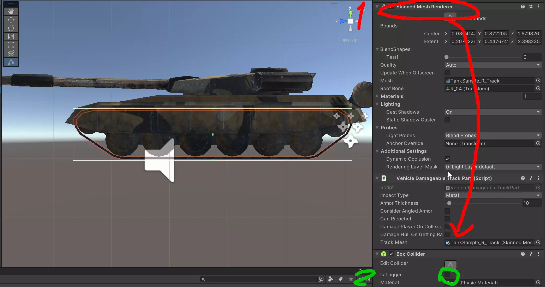 在编辑器中,选择你的履带网格,为其添加新创建的【车辆可损坏履带部件】脚本和【盒体碰撞器】。 在【车辆可损坏履带部件】组件中,取消勾选所有复选框,将【冲击类型】和【装甲厚度】设置为你需要的值(原版载具似乎将它们分别设置为【金属】和10)。 对于履带网格,只需将【蒙皮网格渲染器】元素拖放到相应字段中。 在【盒体碰撞器】中,不要忘记勾选【是触发器】复选框,这一点很重要。