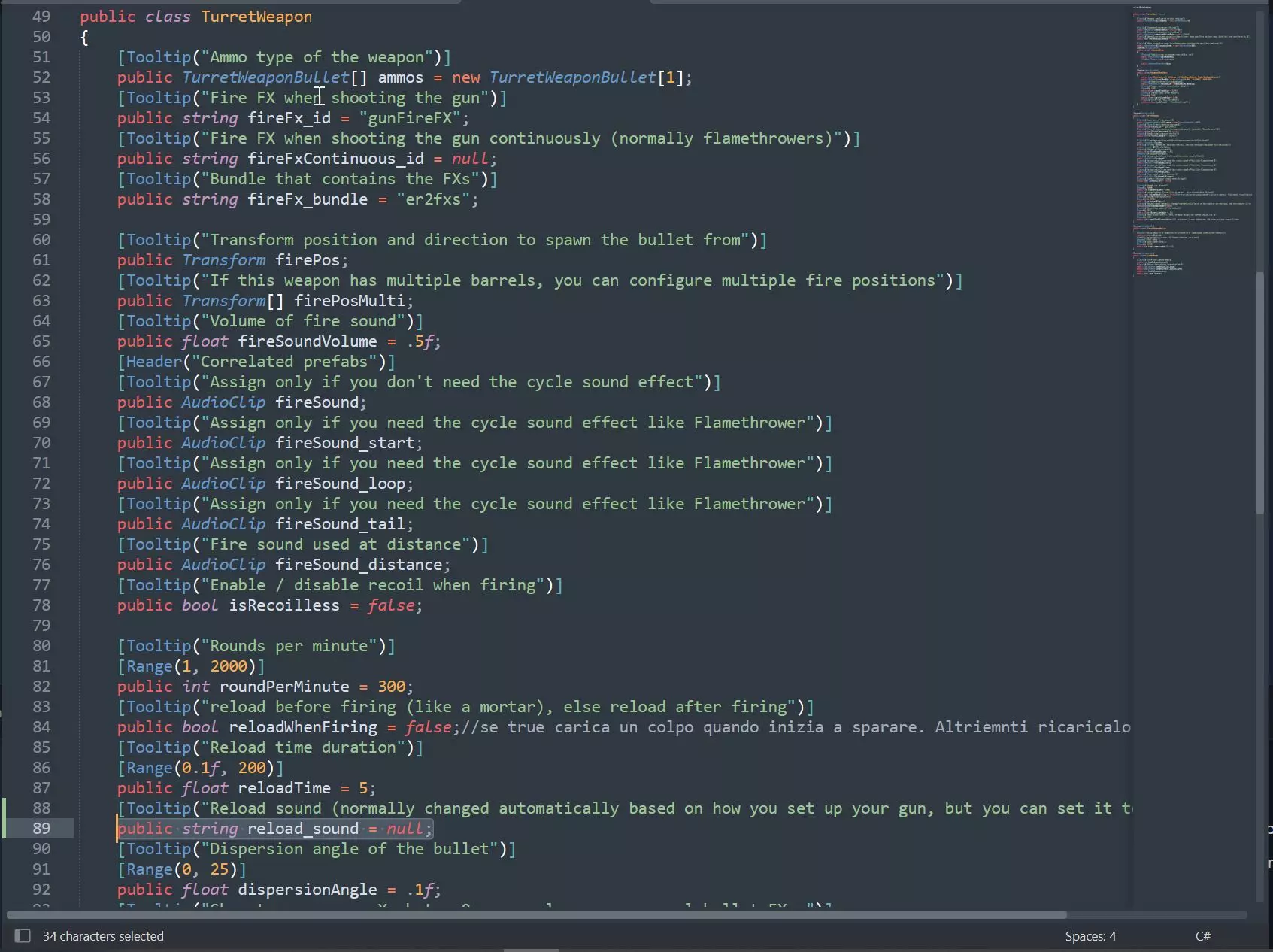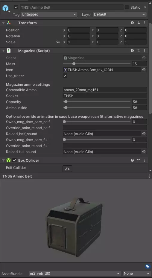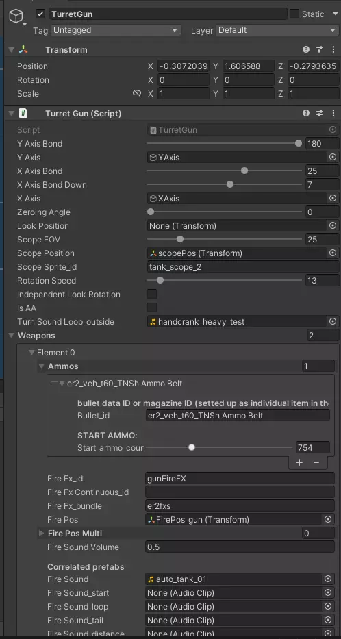 坦克炮与火炮装填时间 坦克炮和火炮的平均装填时间似乎比《战争雷霆》等其他游戏更快。总体而言,小口径火炮(如八九式中战车)的装填时间约为4秒,大口径火炮(如突击坦克和KV-2)则约为8-9秒。具体如下: 机枪:4.5-5秒 机关炮(装备高射炮的载具,如二号坦克或Sd.Kfz.250):6-7秒,四联装高射炮为9秒 小口径火炮(37毫米-57毫米):3-5秒 中口径火炮(小于100毫米):4-5秒 大口径火炮:6-9秒 炮弹预制件 目前无法使用,除非有人能解决相关问题。不过,由于SDK中已包含BulletData脚本,当自定义弹药功能实现后,炮弹预制件应该会变得有用。中型子弹 步枪曳光弹(橙色) 火箭弹2型 大型子弹 火箭弹1型 火箭筒火箭弹 步枪曳光弹 小型加农炮曳光弹 步枪曳光弹(蓝色) 步枪曳光弹(红色) 步枪曳光弹(绿色) 铁拳火箭弹 迫击炮火箭弹 步兵武器弹药【口径类型】 考虑到所有这些弹药都已作为内含一定数量子弹的弹药箱存在,因此其用途不会很大。但仍可用作参考(这些会填入AmmoItem脚本的口径类型字段)。 在炮塔中使用它们等同于使用单独的子弹,而非弹药箱或弹匣(例如,使用7.此部分的92毫米炮弹相当于炮塔中装填的一发炮弹,而如果使用同类型弹药的弹药版本则为20发,若使用机枪弹鼓或弹链则为50-200发。30-06英寸美国弹 30英寸卡宾枪弹 38英寸霰弹 45英寸美国弹 50英寸美国弹 55英寸博伊斯反坦克步枪弹 火焰喷射器1型 12号霰弹 西斯帕诺20毫米机炮 铁拳火箭弹 PIAT火箭弹 坦克杀手火箭弹 火箭弹(注:即巴祖卡火箭弹) 12.7×81毫米半凸缘弹 12毫米 14.5×114毫米俄罗斯弹 20毫米高射炮 20毫米MG151机炮 20毫米九七式机炮 23毫米VYa-23机炮 25毫米九六式机炮 40毫米博福斯穿甲弹 65.0×52毫米意大利弹 65×50毫米日本弹 7.08英寸 7.35×51毫米 75.0×54毫米MAS弹 7.62×25毫米俄罗斯弹 7.62×54毫米俄罗斯弹 7.63×25毫米 7.65×17毫米法国弹 7.65×20毫米长弹 77.0×58毫米日本弹 7.92毫米 7.92×107毫米 7.92毫米短弹 7.92×94毫米 8×22毫米日本弹 8×50毫米勒贝尔弹 8×59毫米布雷达弹 9毫米短弹 9毫米 设置【自定义】换弹音效 此处的“自定义”加引号是因为我尚不确定是否可以设置完全自定义的音效,还是只能使用游戏预设的音效。不过,如果你需要为诸如迫击炮(其装弹音效与坦克炮截然不同)之类的武器修改音效,是可以进行调整的。若要实现这一点,你需要修改SDK中的某个脚本,即Assets ER2 SDK Scripts ER2 Components Veichles TurretGun.cs。打开该脚本后,向下滚动直至找到public class TurretWeapon类。在其中添加一个名为reload_sound的public string变量即可。例如,我是这样操作的(该字符串上方的工具提示并非必需)。
