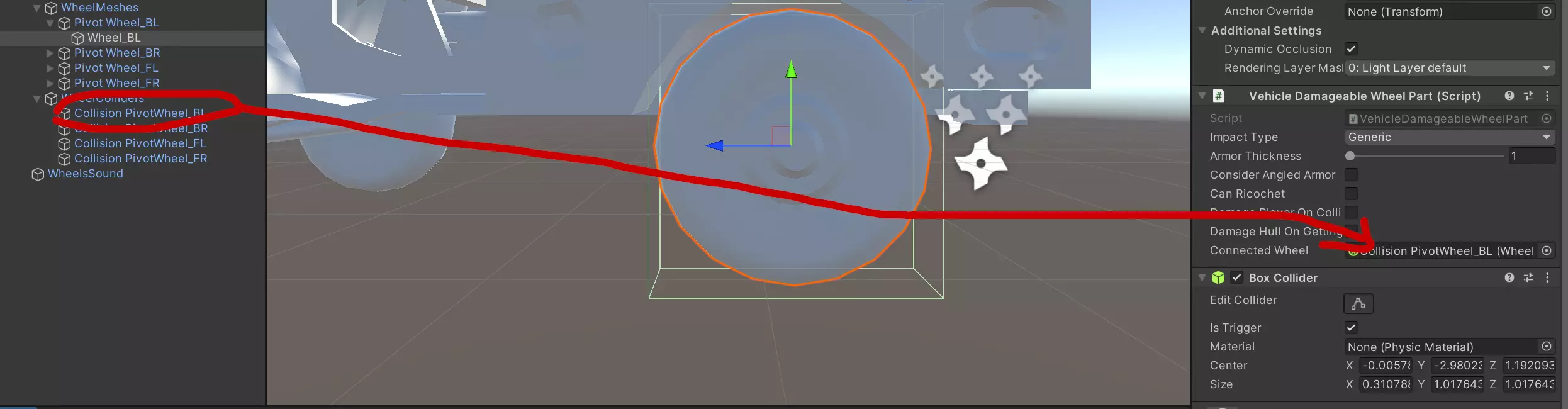 设置可破坏车轮 事实证明,这比设置可破坏履带还要简单。 (假设你已完成车轮的设置) 在Assets ER2 SDK Scripts ER2 Components Veichles文件夹中创建一个新的.cs脚本,命名为VehicleDamageableWheelPart.cs。其内容应如下所示(工具提示仅作为提示): using UnityEngine; public class VehicleDamageableWheelPart : VehicleDamagablePart { [Tooltip("在此处拖放相关的车轮碰撞器")] public WheelCollider connectedWheel; } 找到你的车轮网格,添加新创建的Vehicle Damageable Wheel Part和一个盒体碰撞器。与创建履带类似,勾选盒体碰撞器中的Is Trigger复选框。关于载具可损坏车轮部件,取消勾选所有复选框,拖放相关的车轮碰撞器(例如,在本案例中,由于我正在修改左后轮,因此需要拖放碰撞轴心左后轮)。原版轮式载具通常将装甲厚度设为1,冲击类型设为通用。