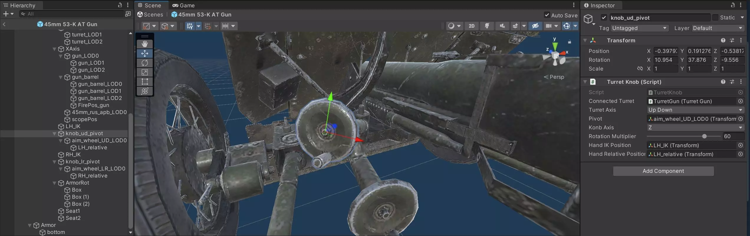 MG弹链和其他炮塔弹匣 如果还需要步兵武器弹匣,请告知。 ammo_strip_8x50_lebel Bofors_mag25 mac31_belt breda_SAFATs_belt cal303_belt type99_20mm_mag20 航空炸弹 之前已添加了一些新的航空炸弹,但具体时间未知。 数值 PlaneBomb30 PlaneBomb60 炮塔支援弹药 将其移至单独章节,因为当前表格过大。 数值 描述 40mm_bofors_ap 博福斯40mm炮弹(单个物品,非盒装或弹匣装) 45mm_20k_he 苏联坦克搭载45mm火炮使用的高爆弹(在列表更新后一段时间添加) 75mm_m1_he M8斯科特自行火炮使用75mm M1破甲弹 - M1迫击炮高爆弹 游戏中所有当前可用迫击炮均使用此弹药。M1迫击炮烟雾弹 - 37mm SA18高爆弹 用于阿登DLC中的FT-17火炮坦克。37mm SA18破甲弹 - 47mm SA35高爆弹 用于阿登DLC中Char B1的炮塔主炮。47mm SA35穿甲高爆弹 - 75mm SA35高爆弹 用于阿登DLC中Char B1的车体主炮。75mm SA35穿甲高爆弹 - 88mm Pak43高爆弹 用于阿登DLC中新增的猎豹坦克歼击车。88mm Pak43 穿甲弹 - 88mm Pak43 烟雾弹 - 75mm M3 高爆弹【谢尔曼巨无霸使用,该坦克在阿登DLC中添加(原版谢尔曼使用75mm M2)】 - 75mm M3 穿甲弹 - 75mm M3 破甲弹 - 105mm LeFH18 高爆弹 - 105mm LeFH18 穿甲高爆弹 - 105mm LeFH18 烟雾弹 - 37mm L45 穿甲高爆弹【三号坦克E型和Pak 36反坦克炮使用】 - 37mm L45 穿甲弹 - 57mm ZiS-2 高爆弹【ZiS-2反坦克炮使用】 - 57mm ZiS-2 穿甲弹 - 230mm 迫击炮高爆弹【丘吉尔AVRE使用】 - 45mm 19-K 穿甲高爆弹【19-K和53-K反坦克炮均使用】45mm_19k_高爆弹 - 70mm_type92bg_高爆弹 用于九二式7厘米火炮。70mm_type92bg_破甲弹 - 57mm_type90_高爆弹 用于八九式甲型中战车的主炮。57mm_type90_破甲弹 - 47mm_3磅炮_高爆弹 用于维克斯Mk.E的主炮。47mm_3磅炮_穿甲弹 - 75mm_mod1939_高爆弹 75/34 M42主炮。75mm_mod1939_破甲弹 - 75mm_mod1939_穿甲弹 - 设置手轮 在各种火炮上设置手轮其实并不复杂,但过程中需要一些反复尝试。 要使其正常工作,需将炮塔旋钮脚本添加到你想要用作手轮的任何物体上。以下是一些值得检查的设置: - 连接炮塔:哪个炮塔应影响手轮的移动。 - 炮塔轴:此手轮控制俯仰(上下)还是旋转(左右)。 - 枢轴:你想要旋转的对象。 - 旋钮轴:你希望手轮沿哪个轴旋转。 - 旋转倍率:手轮旋转的速度(负值会导致手轮反向旋转)。 - 手部IK位置:大致希望角色手部所在的位置。应与根父级中为手部IK设置的对象相同。该对象【不应】父化到手轮下,否则角色的手会旋转。手部相对位置 - 角色旋转手轮时应“握住”的部分。如果你希望角色以控制大多数原版手轮的方式来控制手轮,【这就是你需要将其父子化到手轮枢轴上的对象】。例如,这是我为53-K手轮设置的大致结构。