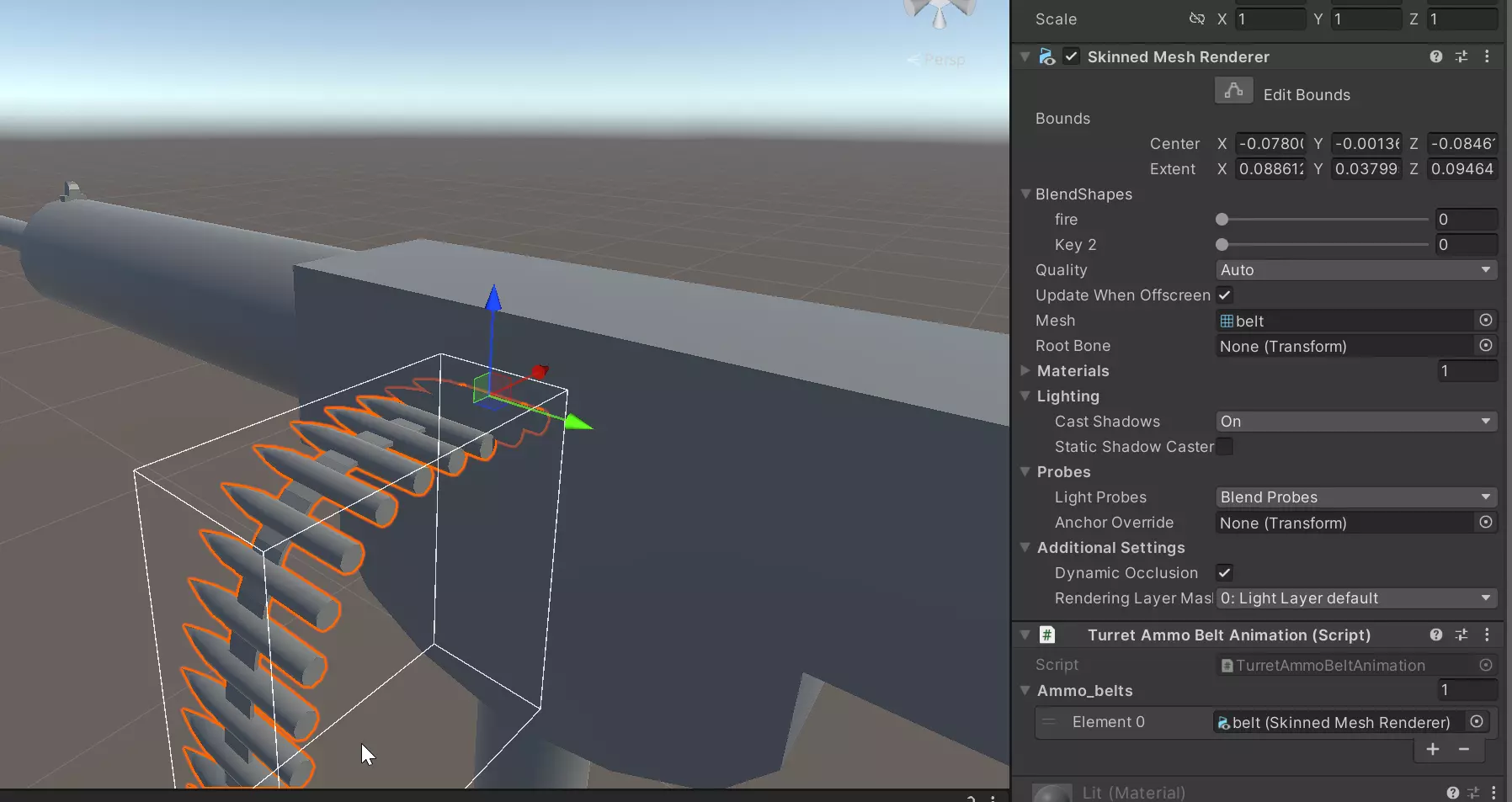 接下来我们需要创建TurretWeaponAnimation.cs、TurretClipAnimation.cs和TurretAmmoBeltAnimation.cs文件(我将它们创建在同一个载具脚本文件夹内)。 TurretWeaponAnimation.cs using System.Collections; using System.Collections.Generic; using System.Security; using UnityEngine; public class TurretWeaponAnimation : MonoBehaviour { } TurretAmmoBeltAnimation.cs using System.Collections; using System.Collections.Generic; using UnityEngine; public class TurretAmmoBeltAnimation : TurretWeaponAnimation { [Tooltip("在此处拖放蒙皮网格渲染器元素")] public SkinnedMeshRenderer[] ammo_belts = new SkinnedMeshRenderer[0]; } TurretClipAnimation.cs using System.Collections; using System.Collections.通用; 使用 UnityEngine; 公共类 TurretClipAnimation : TurretAmmoBeltAnimation { } 在3D编辑软件中,为你的弹链/弹匣添加两个形状键,第一个用于射击动画期间的移动,第二个用于枪械空膛时(将所有内容缩放到0)。在此情境下,弹链和弹匣之间的唯一区别在于,弹匣的最终位置应大致是你希望弹药耗尽后弹匣所处的位置(参见九二式重机枪),而弹链的动画应表现为仅发射了一发子弹(参见游戏中其他任何弹链供弹的机枪,如M1919或MG34)。完成后,为弹链/弹匣网格添加【炮塔弹药弹链动画】脚本(对于弹夹供弹的机枪,则添加【炮塔弹夹动画】脚本),在Ammo_belts数组中创建新元素,并将你的蒙皮网格渲染器拖放到该元素中。
