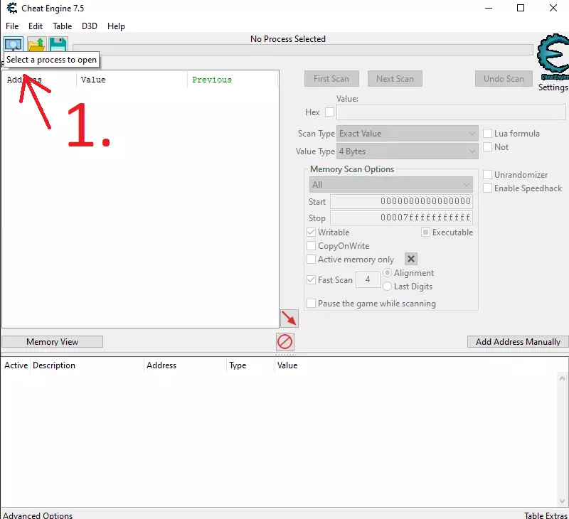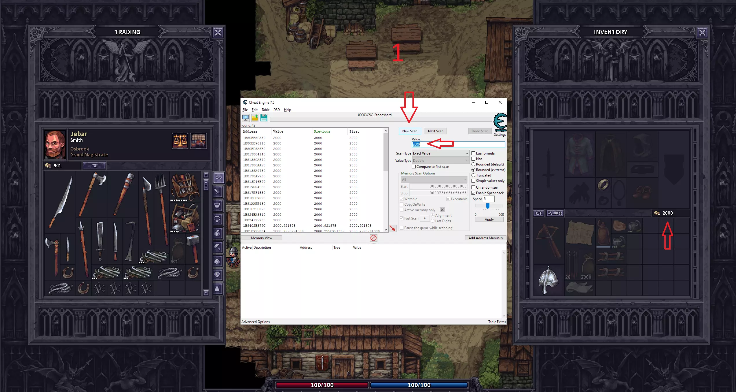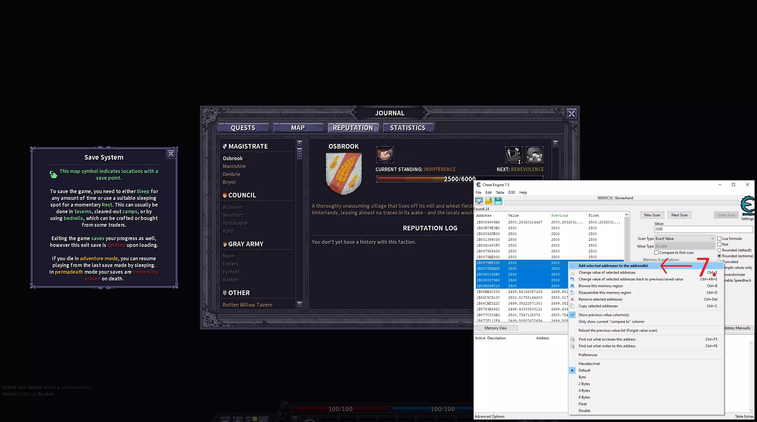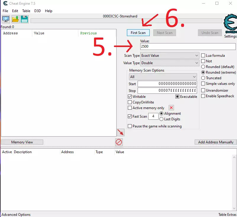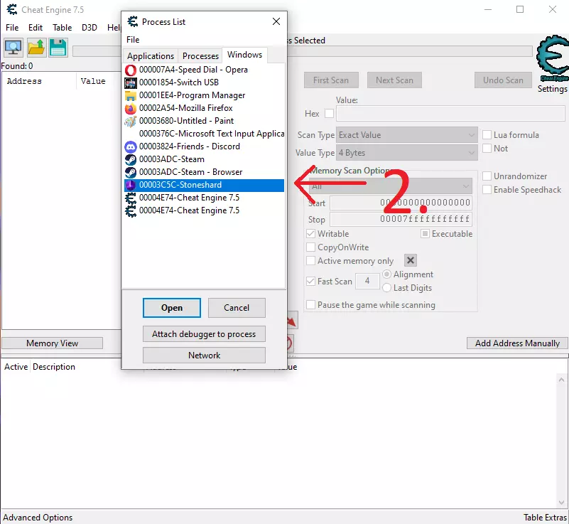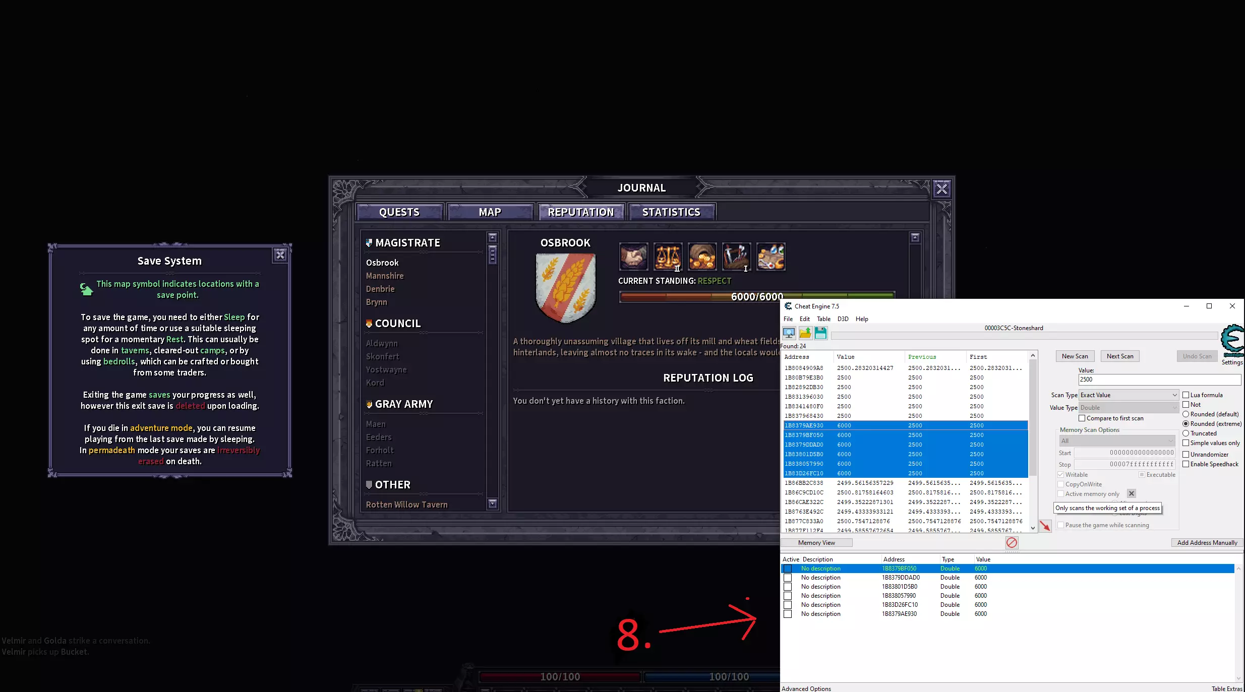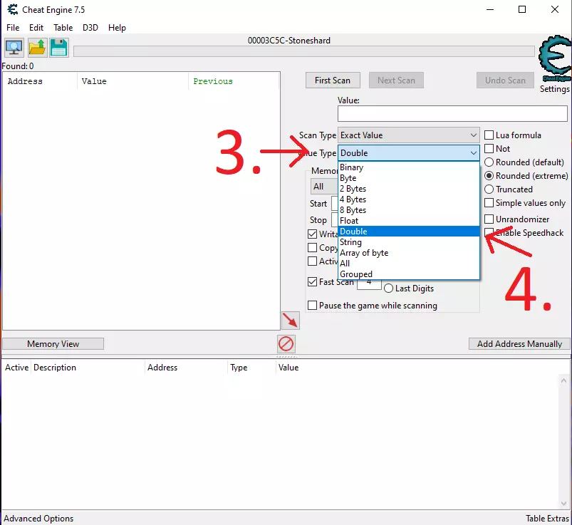 使用CE修改声望、锁定饥饿/口渴值和添加金币的图文分步指南。 声望 1.打开CE并点击选择进程。 2.从列表中选择《石质碎片》。 3-4.将数值类型更改为“双精度”。 5.输入你想要修改的声望值。 注意:新存档中所有城镇的初始声望为2500。如果不是新存档,你的存档中的数值可能不同。你可能需要执行一个能增加或减少当前城镇声望的操作,然后进行“再次扫描”以缩小结果范围。 6.点击“首次扫描”。 7.当找到你想要修改的数值时,选中它们,右键点击并将地址添加到地址列表。 8.将数值修改为你想要的任意值。在我的例子中,我将所有城镇的声望都调到了6000。