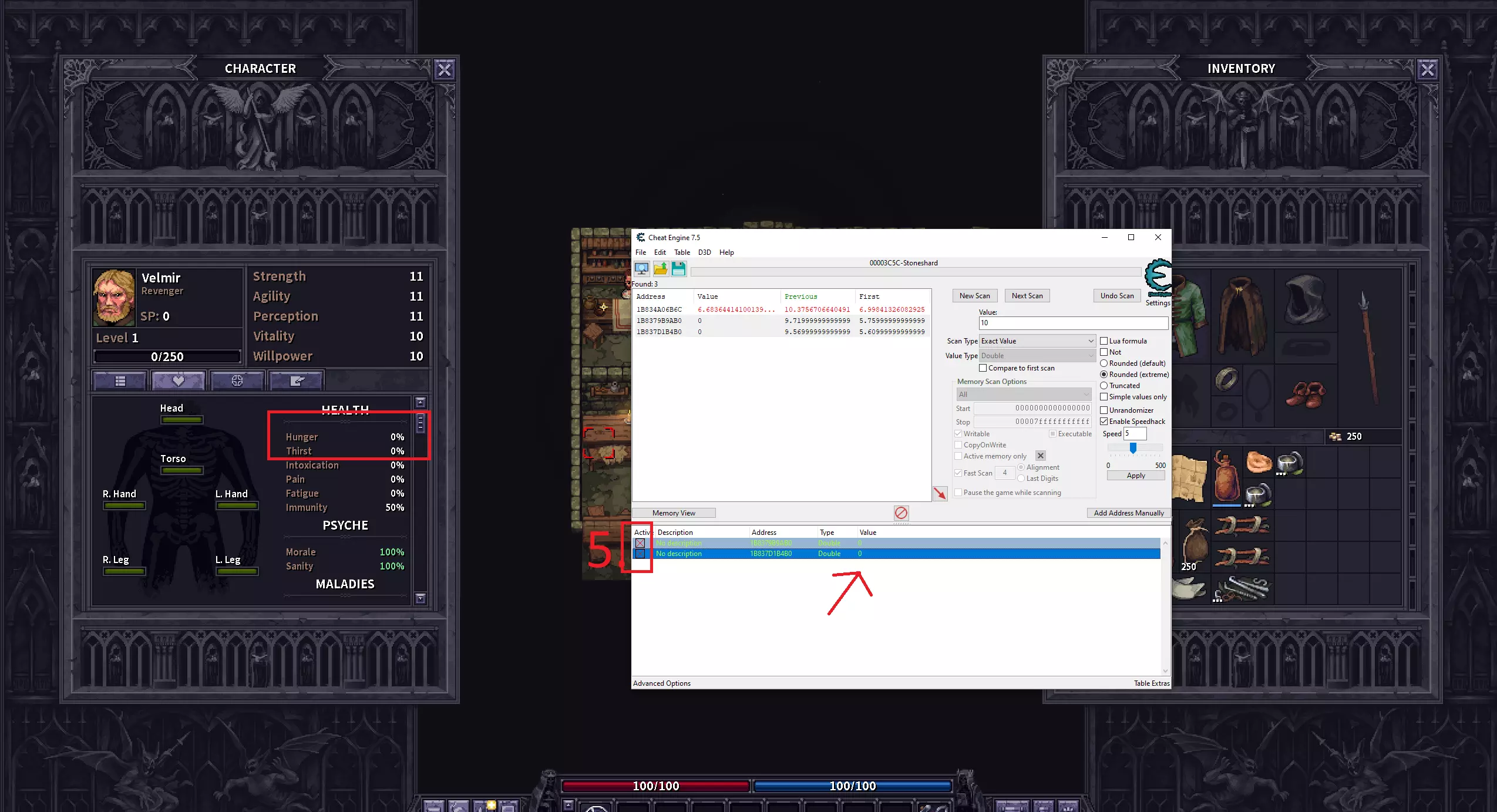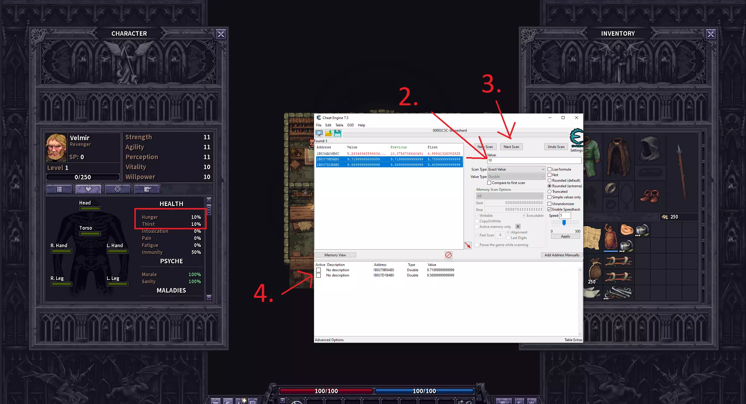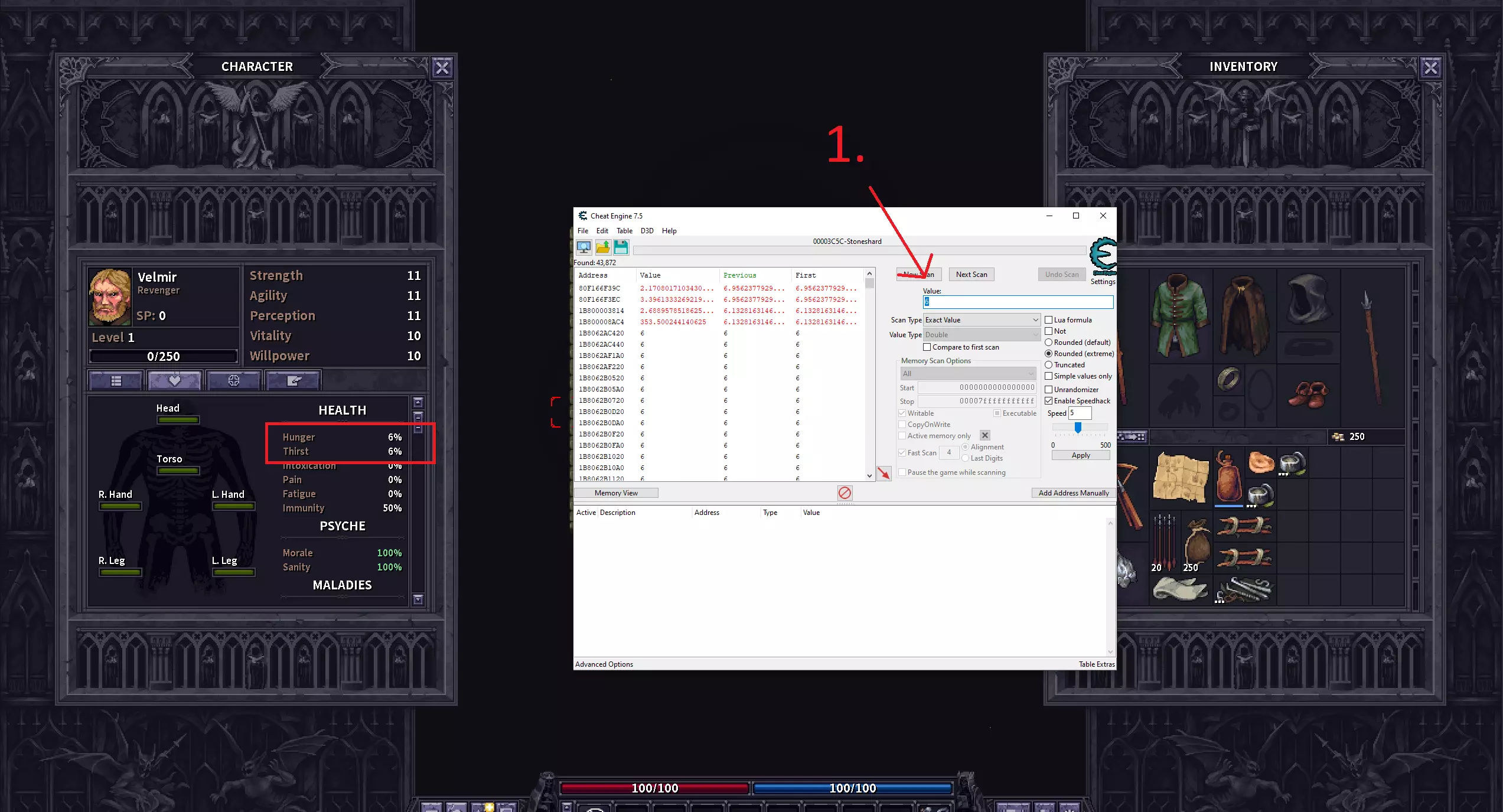 食物与口渴 1. 打开角色面板,找到当前的饥饿值和口渴值,进行首次扫描。 注意:你需要等待饥饿值和口渴值从0和1开始增长,因为扫描这些数值需要很长时间。 2. 在游戏中执行操作直到数值增加,输入新的饥饿/口渴值。 3. 点击“下一步扫描”。 注意:扫描会得到3个数值,但第一个数值变化频繁,可以忽略。 4. 添加2个正确的地址。 5. 勾选【】框以冻结数值。 注意:我曾将数值改为0来确认这些是饥饿值和口渴值,你无需这样做。 注意:不过要小心,我在冻结这些数值时曾遇到游戏崩溃的情况。