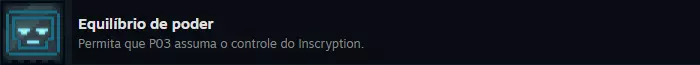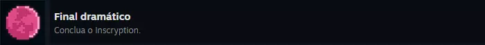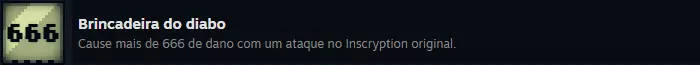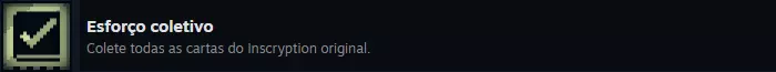 《Inscryption》Steam全成就指南 本指南包含游戏主线通关后解锁的额外模式【Kaycee's Mod】的成就。 ### 简介 《Inscryption》Steam全成就葡萄牙语指南,创建于2024年7月。 ### 重要提示 1. 达成全成就预计需要50至80小时。主线故事的成就可在20至30小时内完成,但【Kaycee's Mod】作为额外游戏模式,难度极高,通关主线后还需准备约50小时来挑战该模式的成就。 2. 游戏存在易错过的成就。你可以在一局游戏中获得所有成就,但你需要提前了解所有成就,这可能会因剧透而破坏你的游戏体验。选择权在你手中。 可错过的成就将在一开始的单独章节中列出。 - 游戏分为3幕; 这三幕实际上相当于3个不同的游戏(不算额外模式),因为每一幕都有许多独特的机制。如果你在第2幕没有获得某个特定成就就进入了第3幕,那么通关后你可以直接从第2幕重新开始游戏(无需再次游玩第1幕),但需要从头开始完整游玩第2幕。因此,如果你不想之后重新玩游戏,请尽量不要错过任何可错过的成就。如果你是第一次游玩,建议只查看下方的【可错过成就】部分,然后在不查看其他成就的情况下进行游戏。这样你就能在尽量减少剧透的前提下享受首次游玩体验。 通关游戏后,再回来查看其他不可错过的成就。 遗憾的是,游戏中的大部分成就都是可错过的,但它们并不难。 第一幕的可错过成就