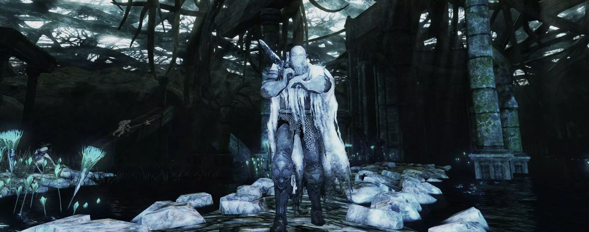 在《黑暗之魂2》的冰冻的埃莱姆洛耶斯区域:在前往第二个篝火【废弃住所】的前一个位置,转向相反方向,穿过一个有空心囚徒的房间,然后登上结冰的斜坡。 • 胸甲:古老的铁甲
