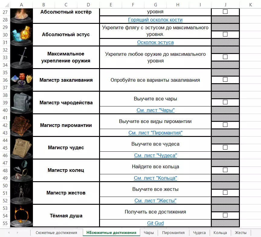 我整理了一个(或许)方便的Excel表格,包含游戏中所有成就以及获取全部成就所需的收集品。该表格的灵感来源于SOLNCE用户制作的《黑暗之魂》初代和二代的同类表格。此表格旨在简化追踪收集咒术、 pyromancy(咒术之火)、奇迹、戒指和手势的过程,并方便引导至俄语DS Wiki获取更多信息。创建原因:我确信这份指南的时效性可能已经大打折扣,但它肯定对我以及那些在2024、2025年仍在玩该游戏的人有所帮助。或是因为其他原因在玩《黑暗之魂3》。我早就有个愿望,就是把这款游戏全成就通关。现在我已经通关3次了,接下来只需要仔细检查背包,整理数十个手势、100多个戒指、上百种法术,还要确认8个主要誓约的情况……而且,每次都得上网查有没有某些物品,有时候物品名称还很相似,真是个麻烦事。