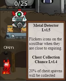 建筑材料是游戏中的新物品(2021年5月14日推出),可通过箱子和挖掘获得。它们用于建造箱子收集器、金属探测器、贸易站、管理器、石油塔和宝石锻造厂,也用于提升游戏中这些建筑的等级。金属探测器和管理器不再能通过箱子获取。你可以从普通宝箱中收集1个建筑材料,从黄金宝箱中收集50个建筑材料。 金属探测器 当你处于1-250公里深度时,有3%的概率从黄金宝箱中获得金属探测器;深度超过250公里时,概率为6%。在达到250公里深度后,普通宝藏宝箱有1%的概率出现金属探测器。 金属探测器会在新闻推送中通知你黄金宝箱的出现,并且在有宝箱时会闪烁。金属探测器有5个升级等级,无法跳过。 1级