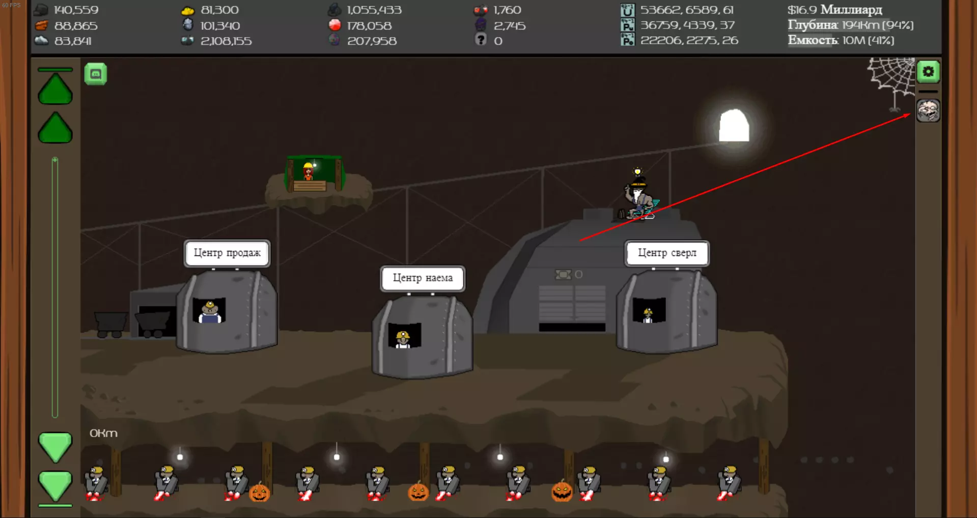 魔像 魔像是一个NPC,会向你出售钻机的后续升级。你可以在50公里深度找到它。 此外,右上角会出现快速移动到魔像的按钮。