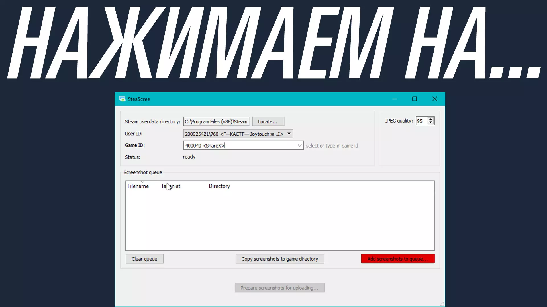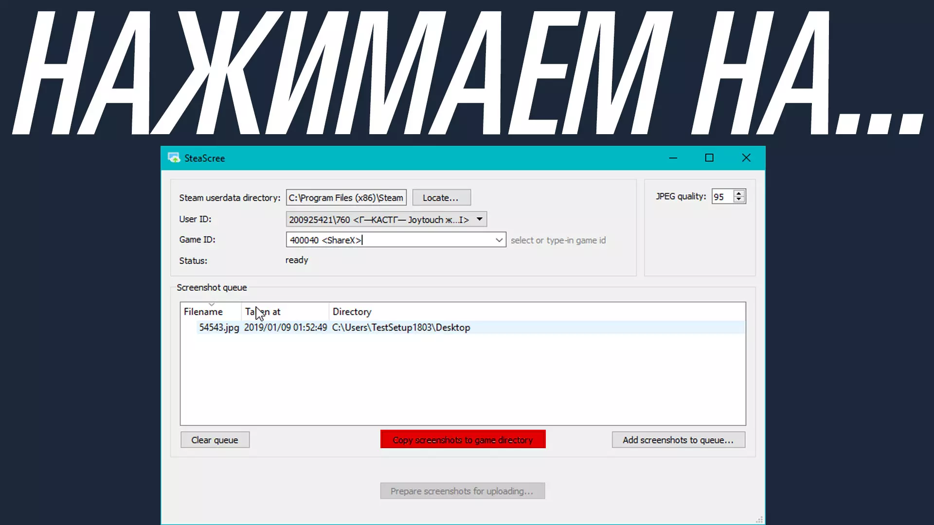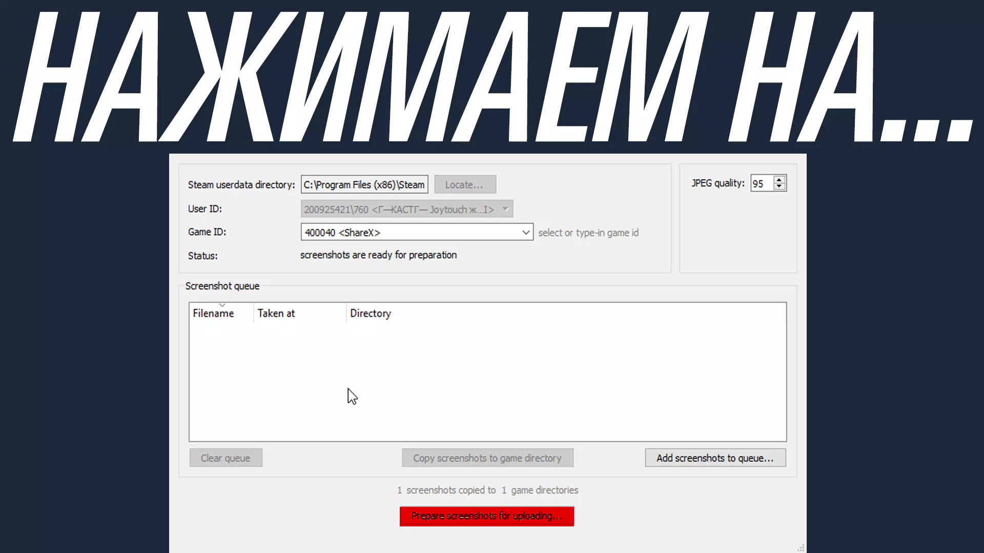 现在,当你完成上述操作后,需要进入【截图】文件夹。 你想要上传到Steam的截图必须是JPG格式。你可以通过ShareX进行设置,让其直接截取JPG格式的截图而非PNG格式;或者你也可以使用类似Photoshop或画图工具编辑截图,并将其保存为JPG格式,将PNG格式转换为JPG格式。 当你准备好JPG格式的截图后,将它们放入【截图】文件夹。